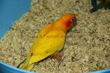 Compared to other sun conures I see ( I work at a bird store, after all, lol! ), he has very little yellow on his wings. Also some of his flight feathers grow in clear yellow, as well as there being a yellow tip on some of his tail feathers.
