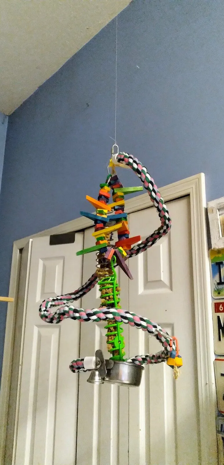 I'm often posting how I use ceiling hooks abd heavy weight fishing line to create what I call an aerial gym. I attach foraging stuff, stuff to chew, and treats to find to keep my flock busy. So now I will share examples to inspire you. Hopefully you all will share yours to inspire me too! this...