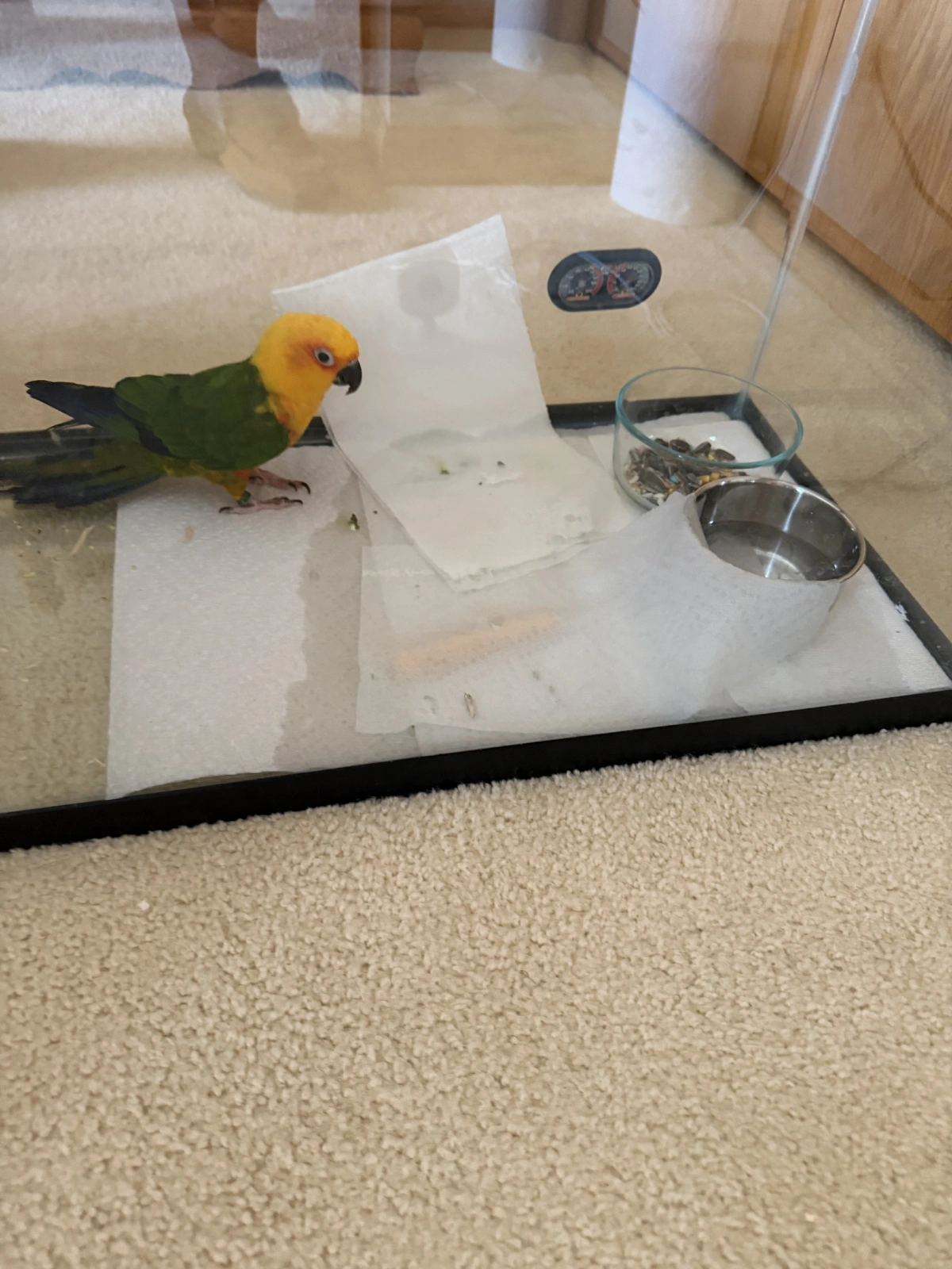 Kiwi wasn’t dealing well with quarantine. She was dumping her water dish, destroying the paper towels, putting the paper towels in her water dish, putting her wood toys in her water dish, and kept trying to escape.