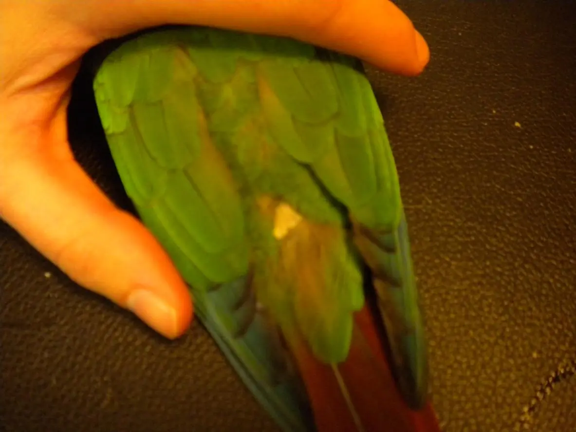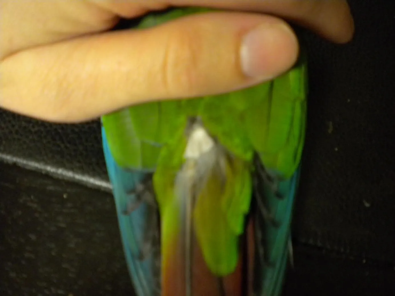 I have a question about a weird feather I saw on Cheeky. Have you ever seen one of these before, and what the heck is it? I can't get a great shot of it because of the lighting, but I hope you can see what I mean.