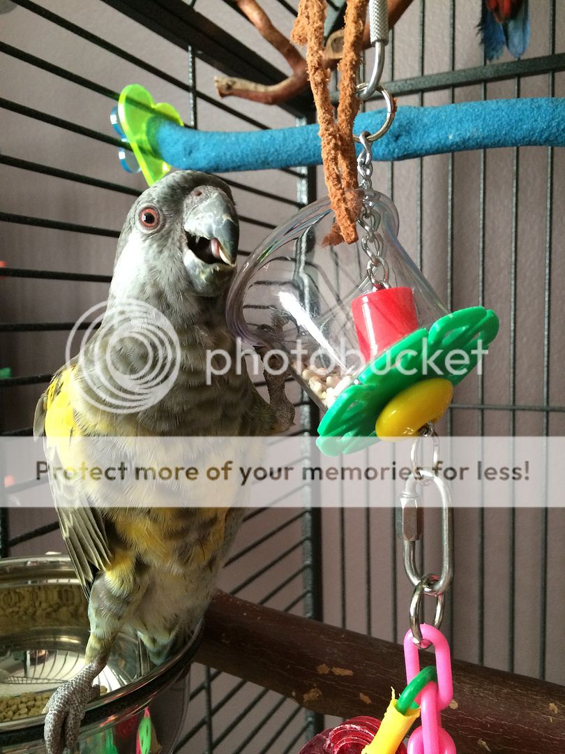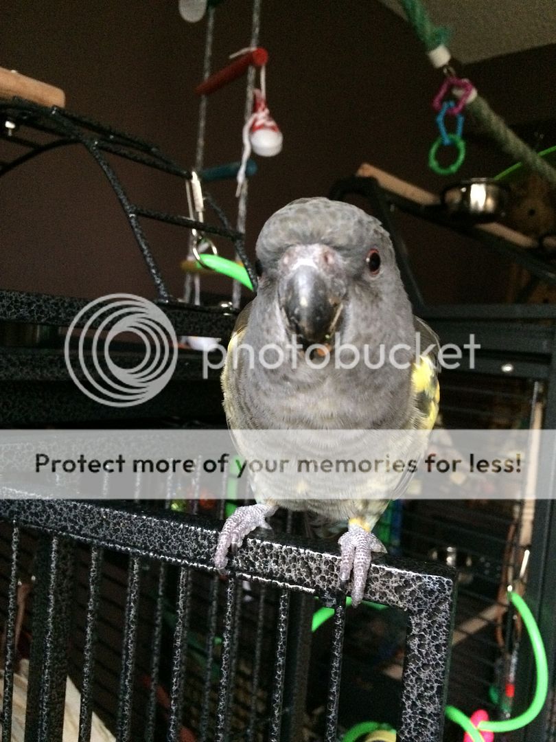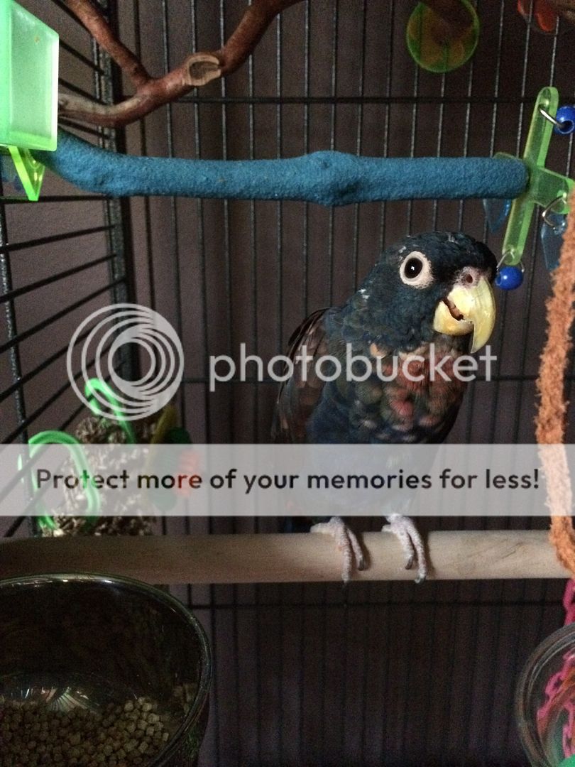 Raven, my Bronze Winged Pionus. The BEFORE pic was on his 1st birthday in August. The after pic was today.