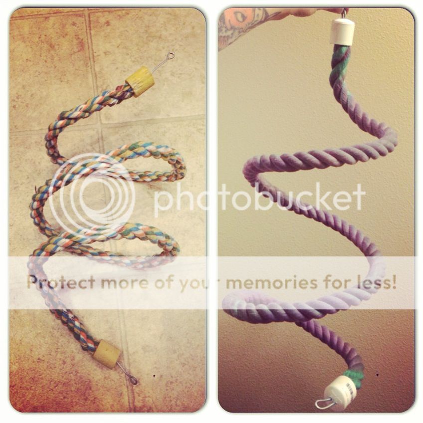 So I stripped the rope and wood caps off, re-used the wire and added new rope that I dyed by spritzing it on with a spray bottle (see link below for how to make your own bird safe dyes).