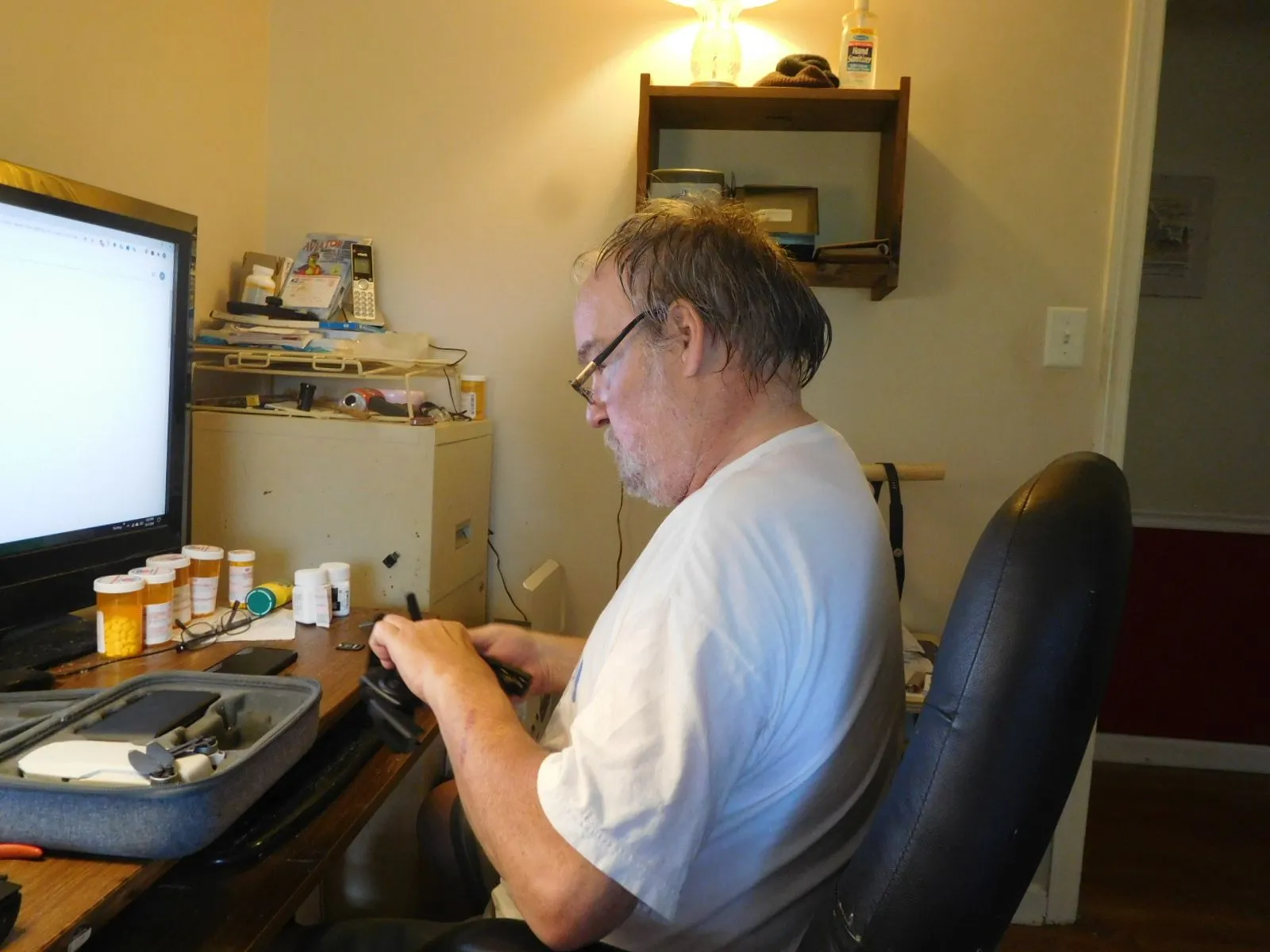 Fiddling with his drones. Coincidentally(?) the company that made the drone is called Parrot.