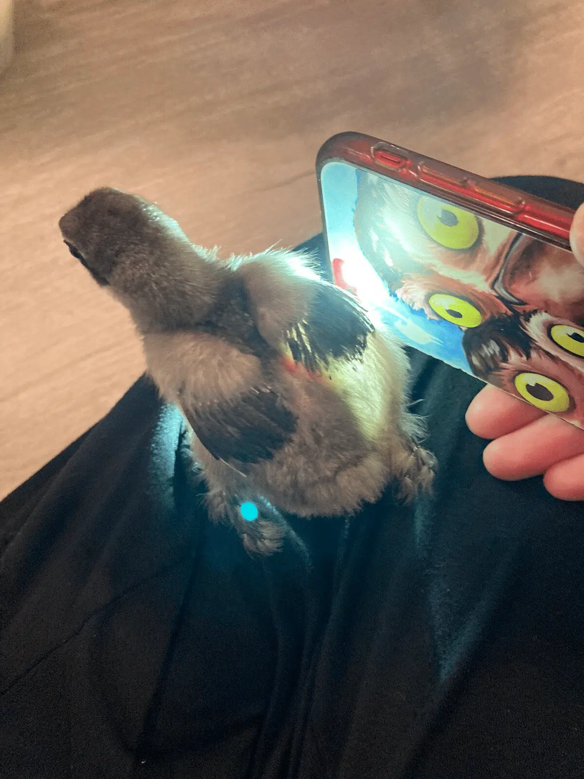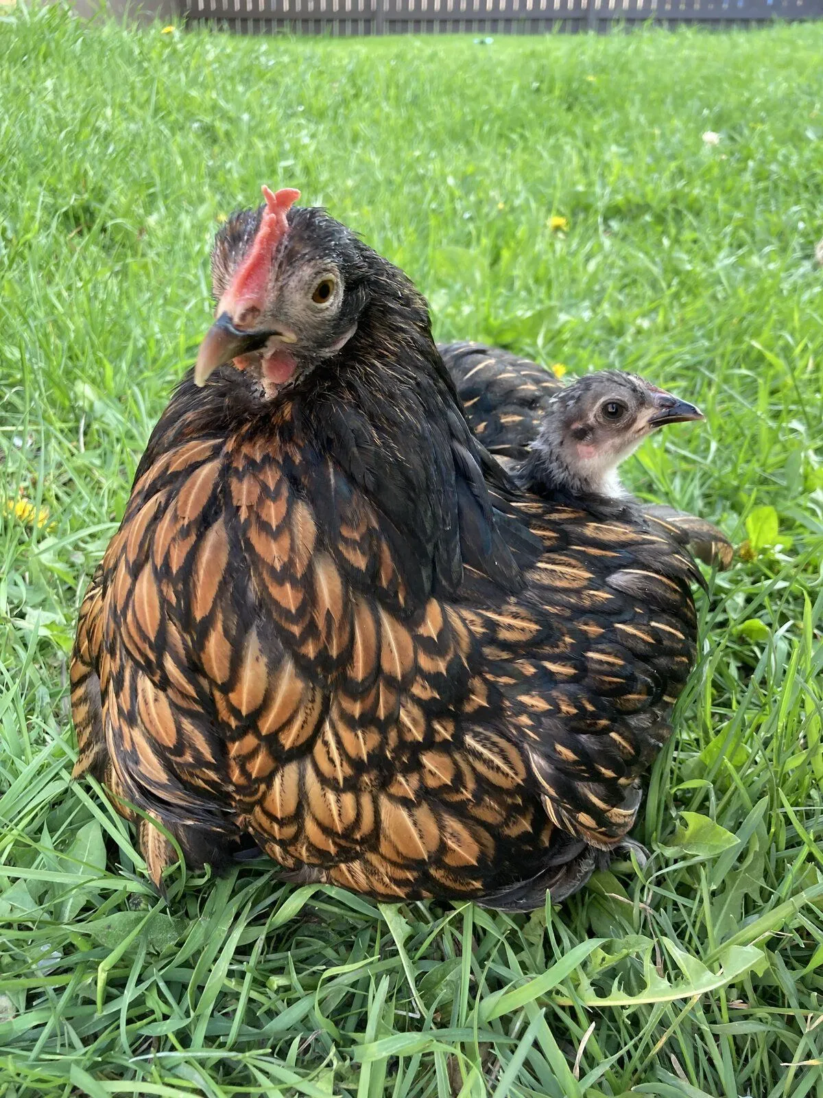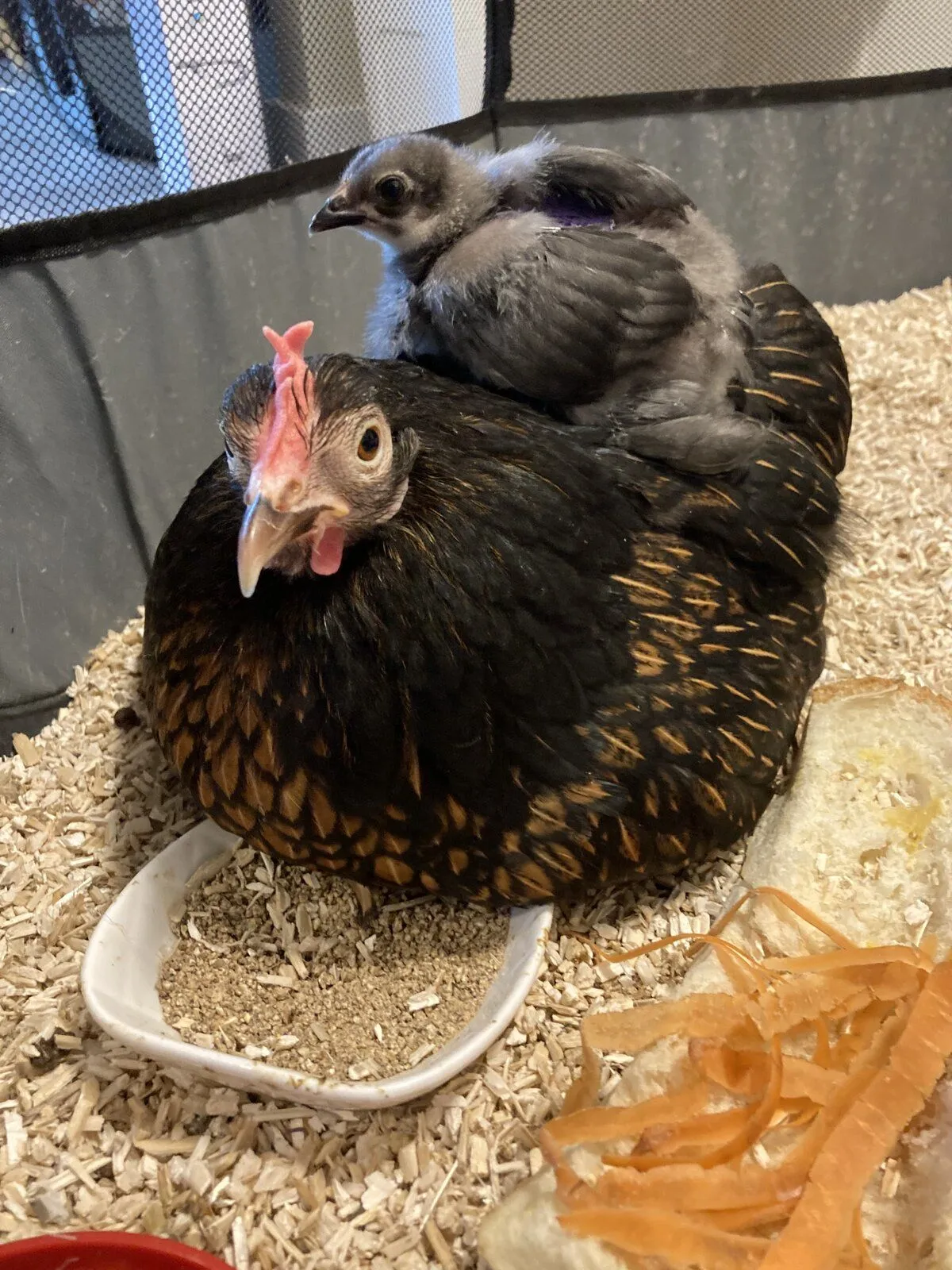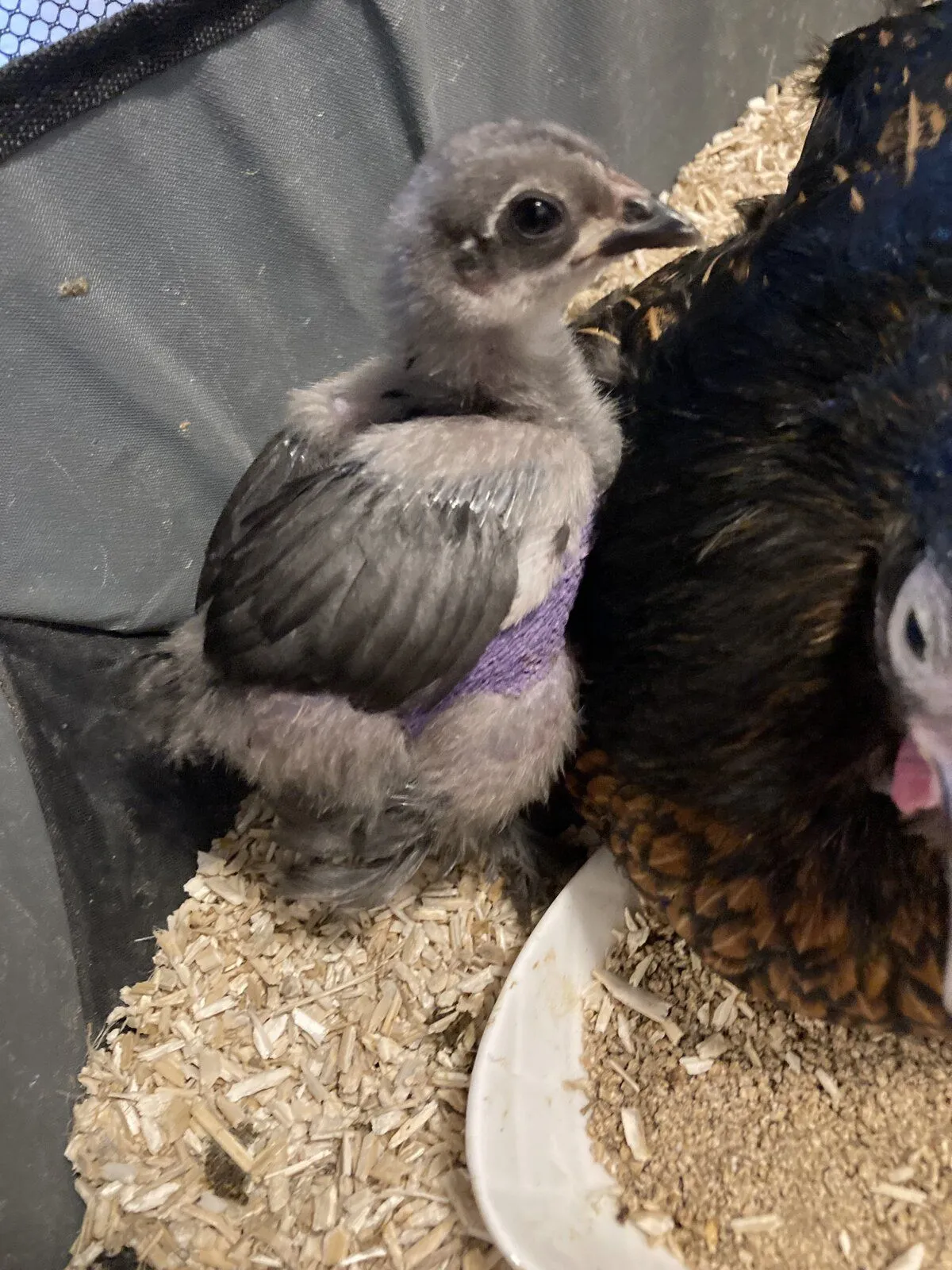 The chick was two weeks old when we noticed she was inflating and sheās four weeks today. She hasnāt showed any signs of struggle in any way apart from her side becoming grossly inflated. She eats, she drinks, she poops, and she crawls all over her foster mom, sheās very happy and healthy apart from being a tiny balloon.