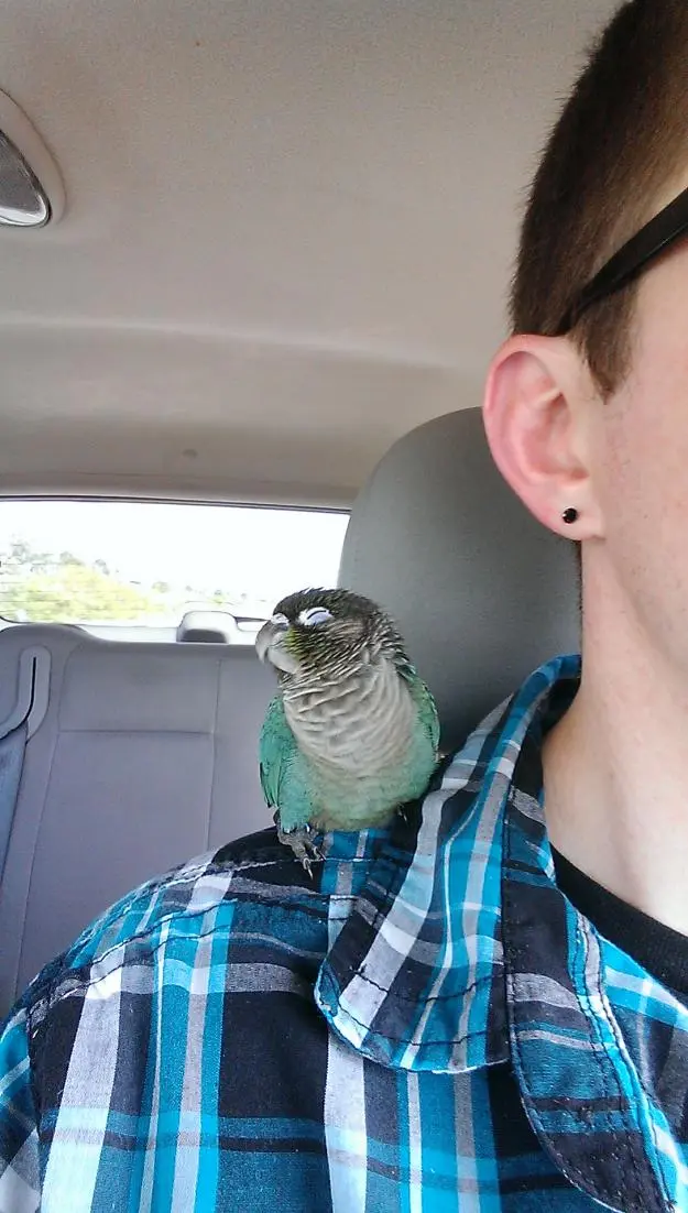 The trip home went great. She wasn't shy or easily spooked at all. She spent almost the entire 3-hour trip chewing on my ear, pooping on my shoulder, and quietly chirping to add to the conversation.