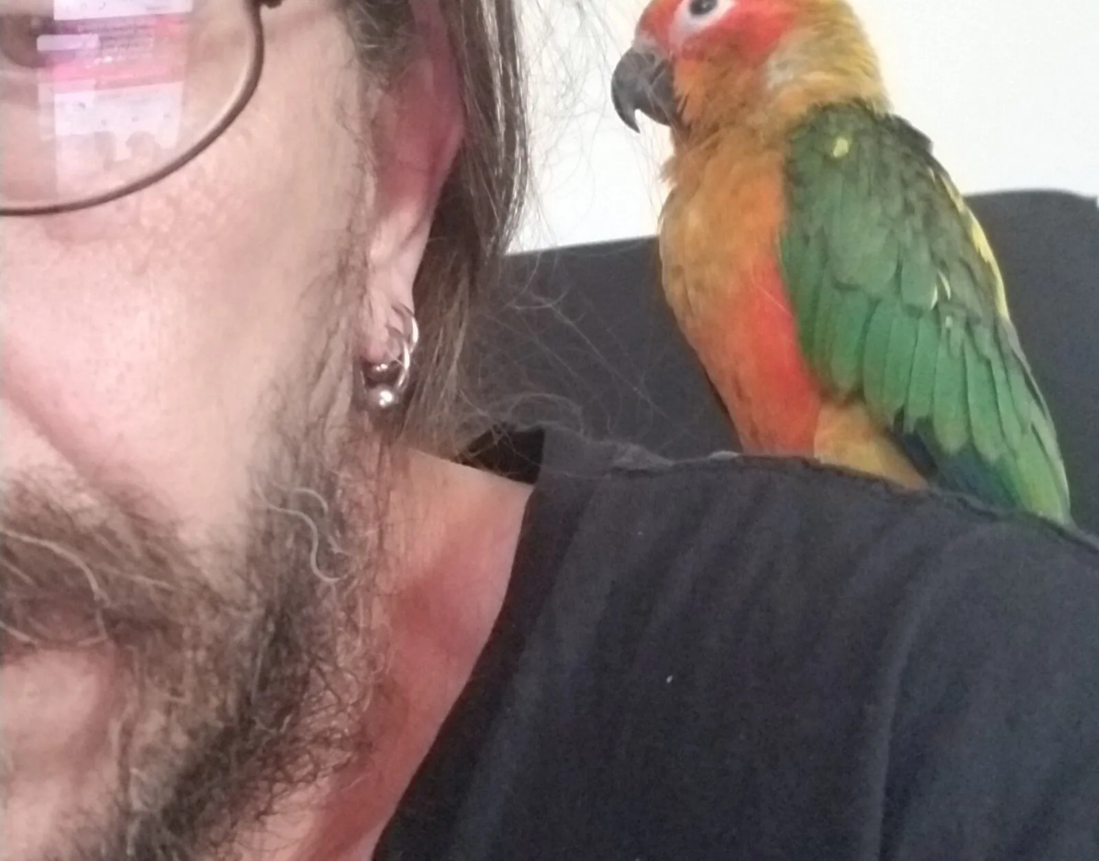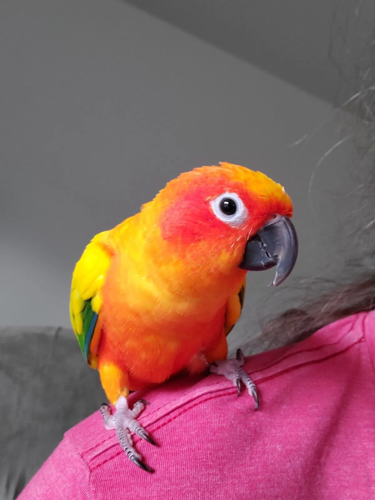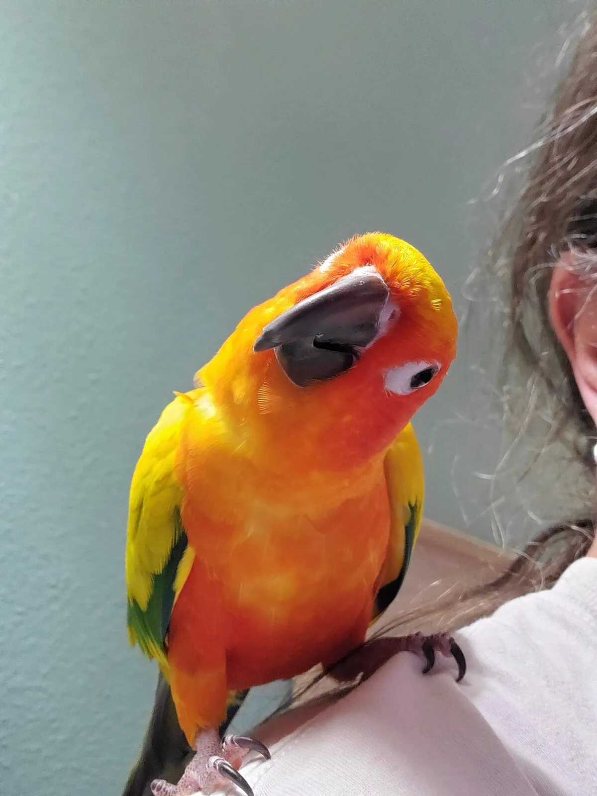 Like I said tho he was out all day everyday. As soon as I woke I opened his door and he would be waiting on the door for me to open it. He would ride the door as I opened it. Once all the way open he would climb up to the top, stretch out his wings then fly over to me. His curiosity was off the charts, had to investigate everything...