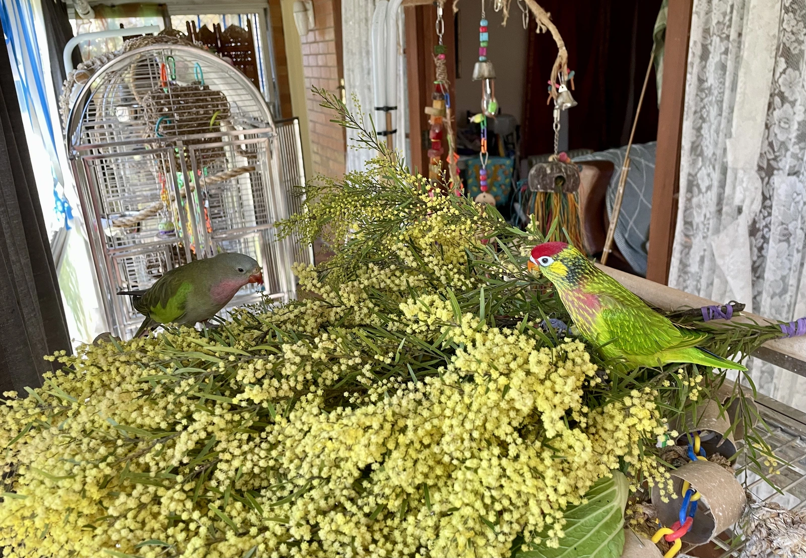 - Fang ({ab}normal grey cockatiel), Valentino (budgie), Jem (cinnamon cockatiel), Lovejoy(varied lorikeet), Peach (princess parrot)