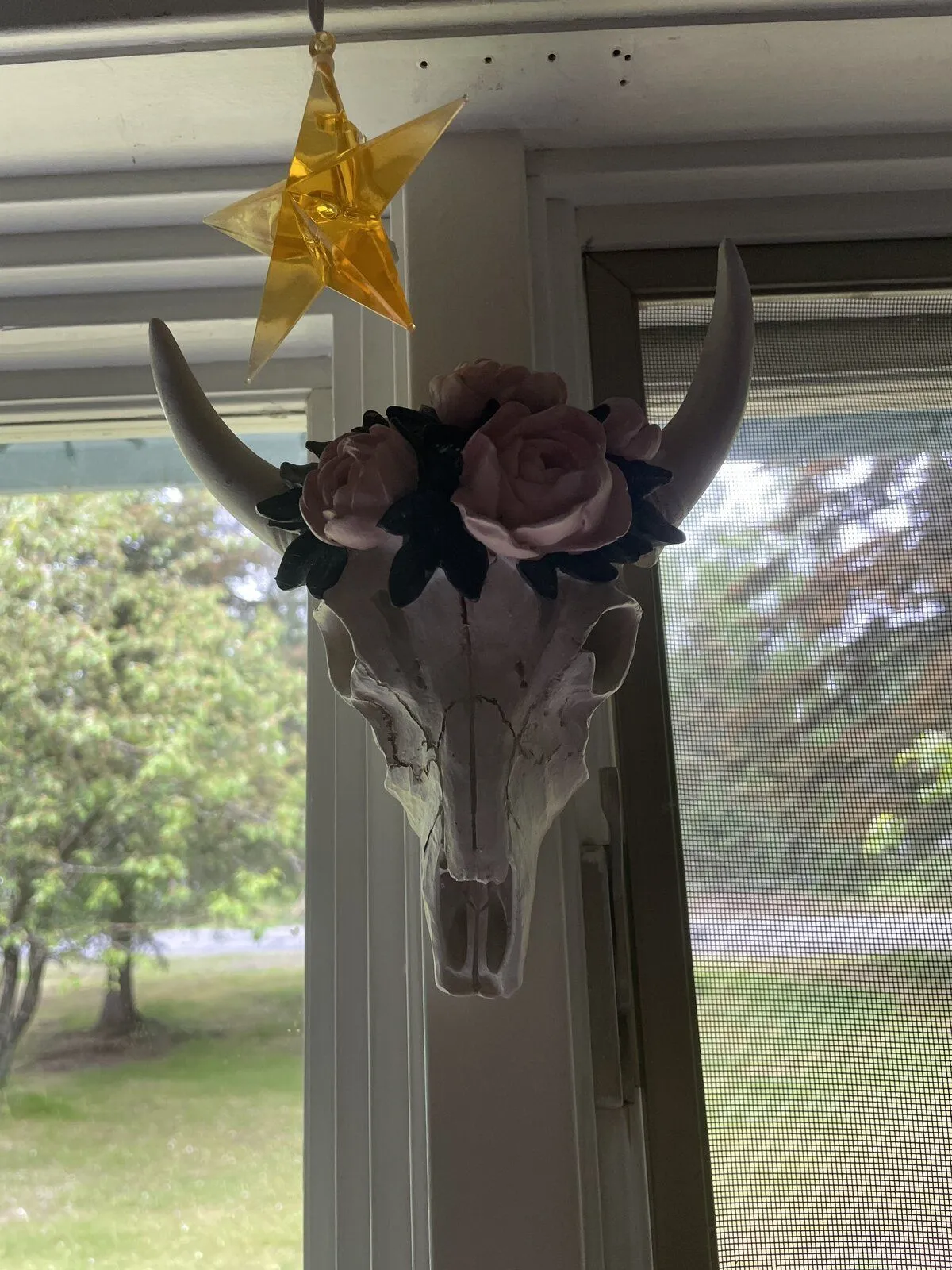The resin cow skull? I think it’s pretty, but I’m pretty biased since I am into vulture culture and have taxidermy fox tails on my wall lolThat thing hanging on the window trim would give me nightmares!