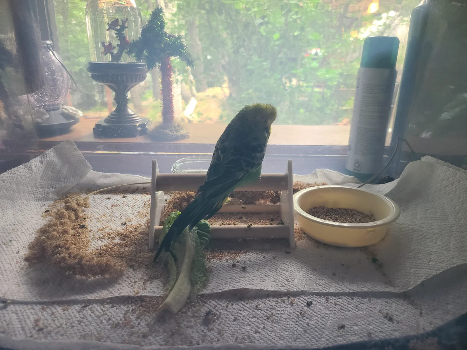 This whole thing with Mariah began when I found her six days ago on the floor in my house at the end of the day when all the budgies were going to sleep. Her balance seems okay, but she stumbles and falls onto her back when she moves around too quickly in her bin and has difficulty flipping back onto her feet so I help her. She does some grooming and stretches her wings. I keep her millet spray (the easiest most tempting food for her) right there at her perch stand and a bowl of water a couple steps away along with a fresh leaf of wet romaine lettuce, mostly for moisture. I hold her in a small towel once a day and make sure her vent is clean. She struggles some when I do this but not like a strong healthy budgie would.