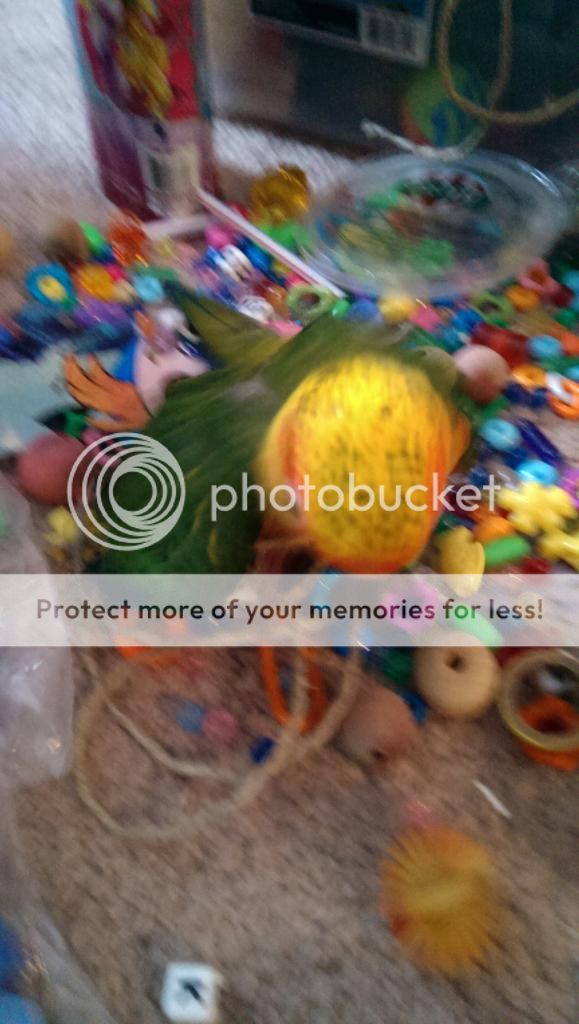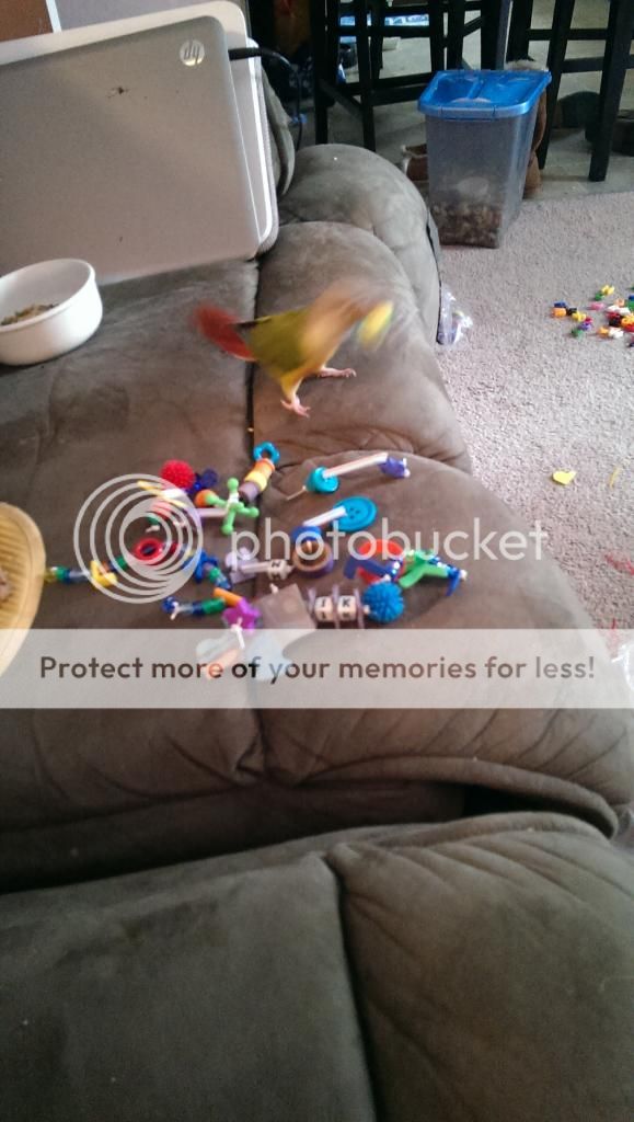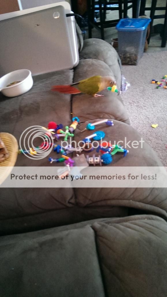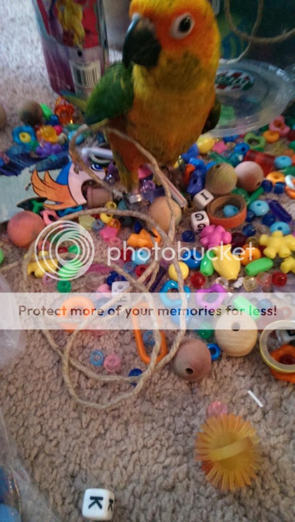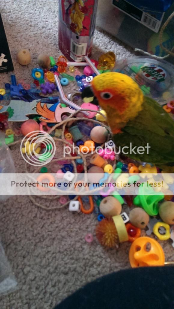 I have found my conures love these kind of foot toys hopefully it gives you some ideas! My tiels also like when I make a string of beads with the plastic lacing substituting as string. They will snap the knot off the end and watch it all crash to the bottom of their cage. I swear there is glee on their faces whenever they do it!