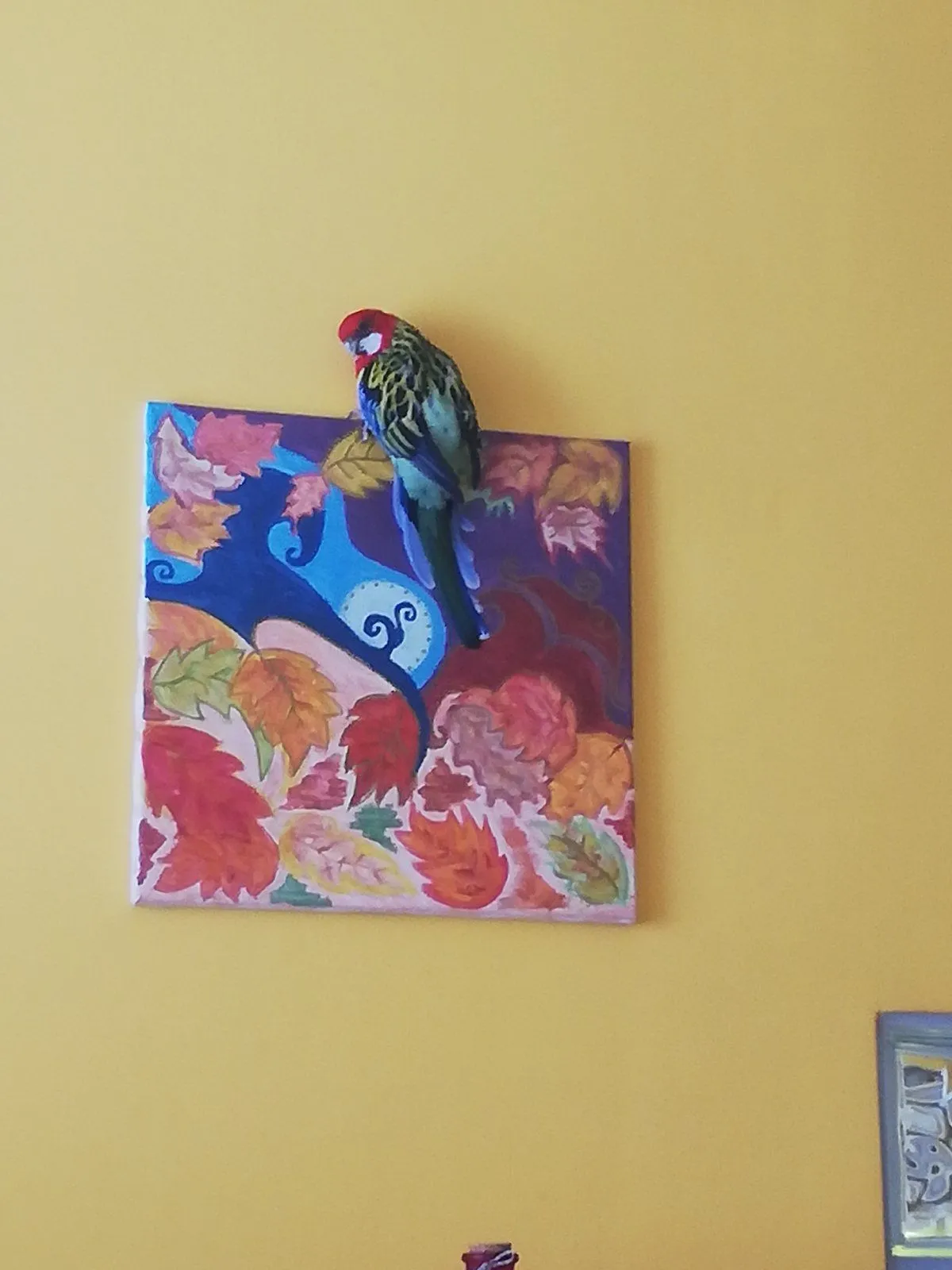 So pretty he almost looks like part of of the artwork! What kind of parrot is he?My parrot Оgy decided to come out of his cage today, alone, curiously and slowly... I'm so happy!View attachment 49716