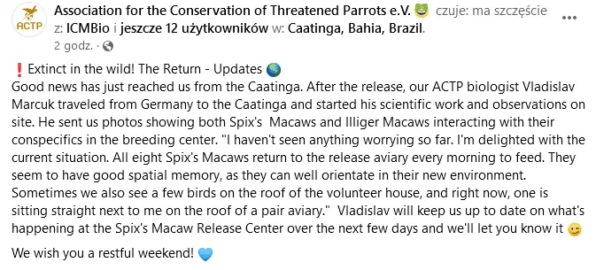 ❗️Extinct in the wild! The return - tomorrow is the day! A dream comes true - Spix's Macaws will be flying in the skies of Brazil tomorrow 🇧🇷 Eight...