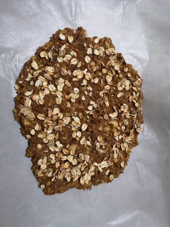 If making the giant cookie, place some of the dough on the parchment paper and even it out until it is about ¼ inch thick. I used about a cup of dough for mine. Top with toasted/plain oats.