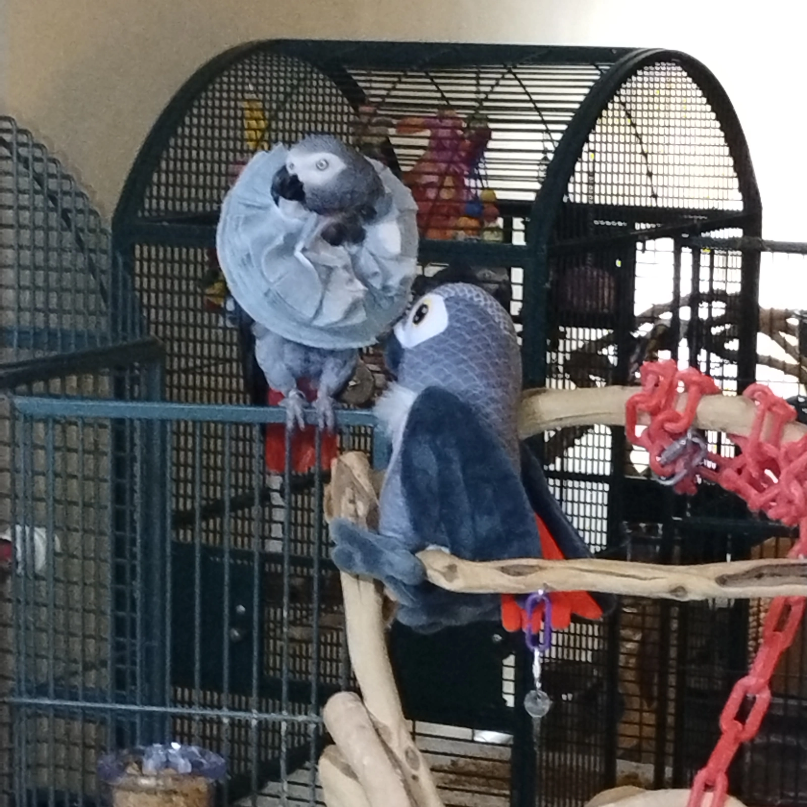 My African Grey was going through a rough molt that became infected. She has been in a soft collar since June, has seen 3 vets and had a biopsy at the end of November. Long story but she hates that collar and will thrash about trying to get it off. I think one reason she hates it is because it blocks her vision. Does anyone have any ideas? The vets say she has to keep the collar on until she has fully healed.