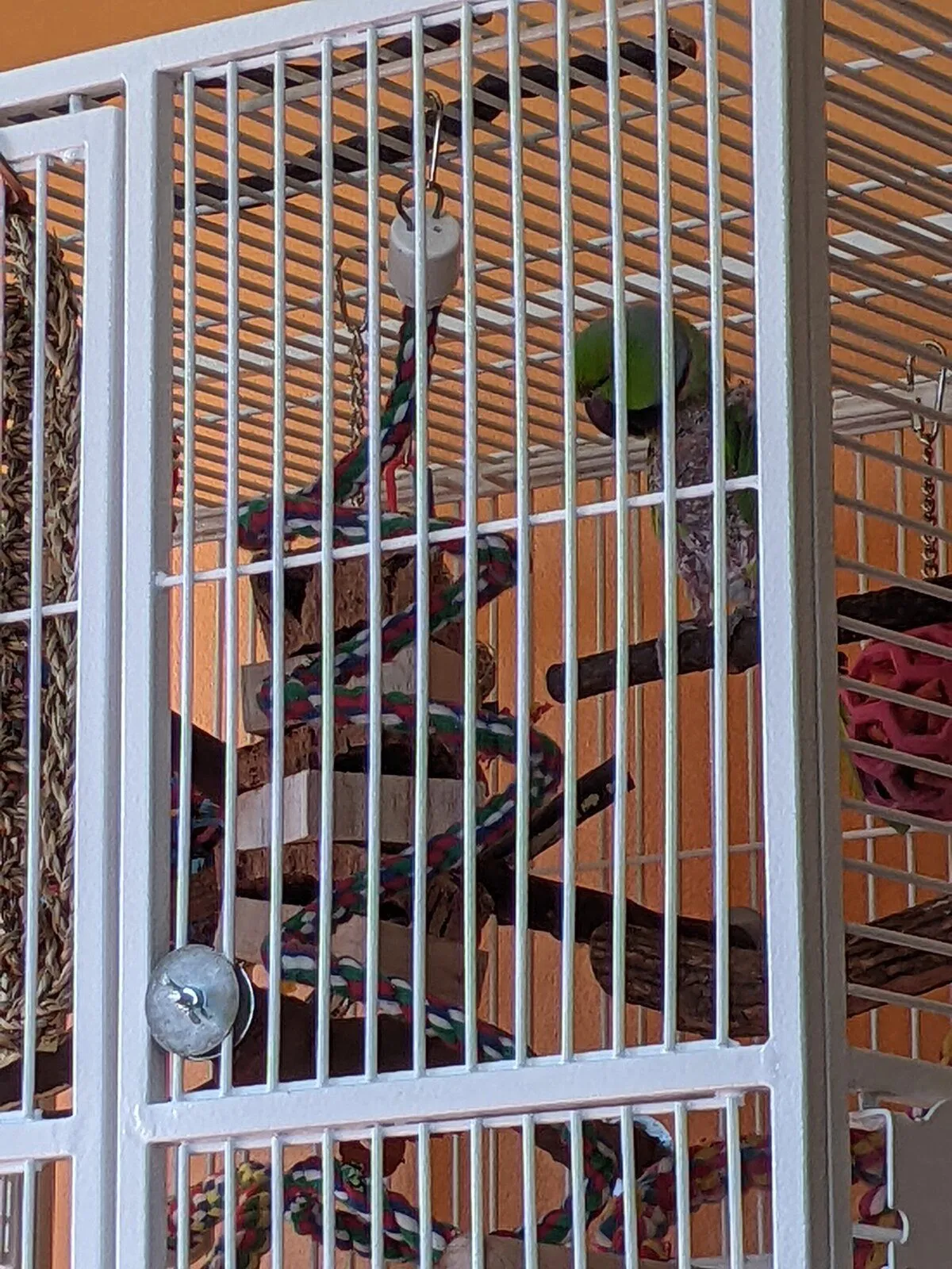 He seems to be settling in as I expected - very wary of activity around him, checking everything out in his cage, and jumpy at noises he hasn't heard before. I'm talking to him lots, basically narrating everything every moment and letting him know where the dog is when she starts walking around the other room. His chosen sleeping spot last night was the opposite corner from his favorite spot in his rescue cage so I already need to rearrange/add a perch or few to give him better access all the way across.