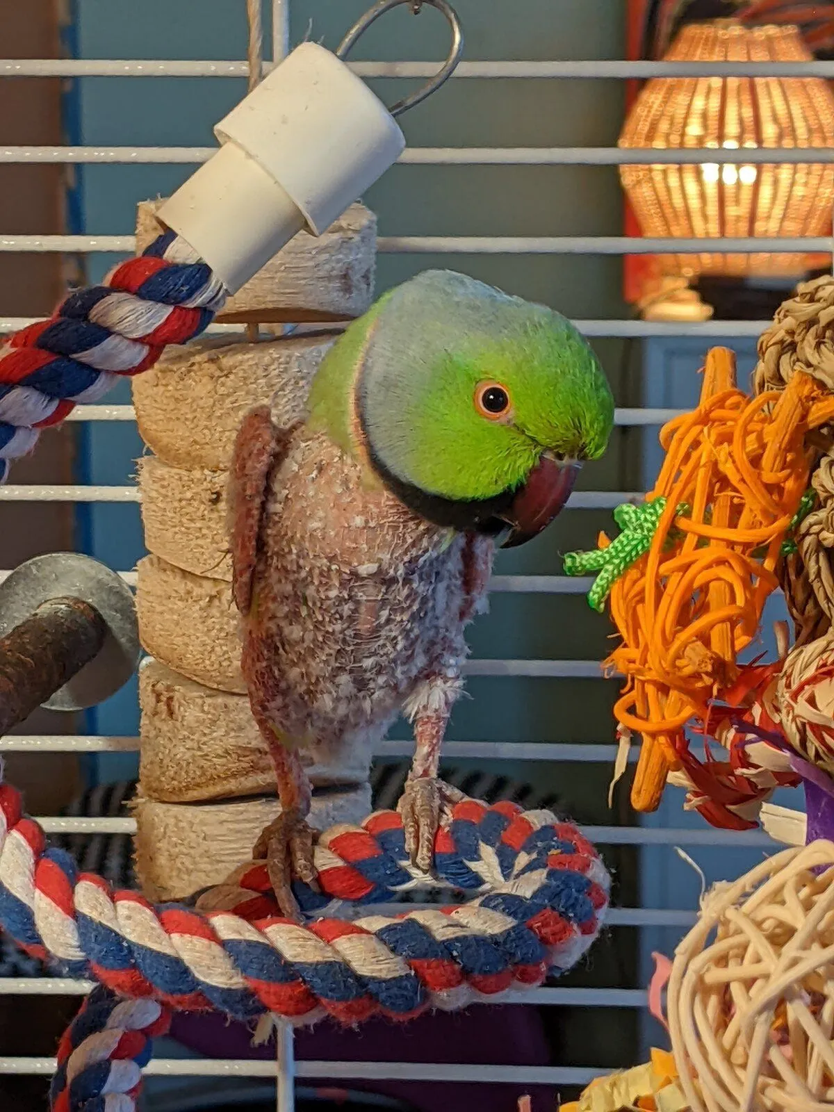 My vet didn't see any evidence of a current yeast infection either on his skin or in his mouth or crop, so I really hope that is in Cotton's past! He's starting to get more downy feathers now and has sprouted a few shoulder feathers (shhhh don't tell him!). I also rearranged his cage a little bit after his vet visit when I cleaned it, because I think hitting his feathers when flapping might have been part of why he started snipping them off. And he'd left his tail alone until he fell off his perch in the car, so maybe he bonked that too. I'll have to be more vigilant about how he's using his space if he lets his feathers keep growing.