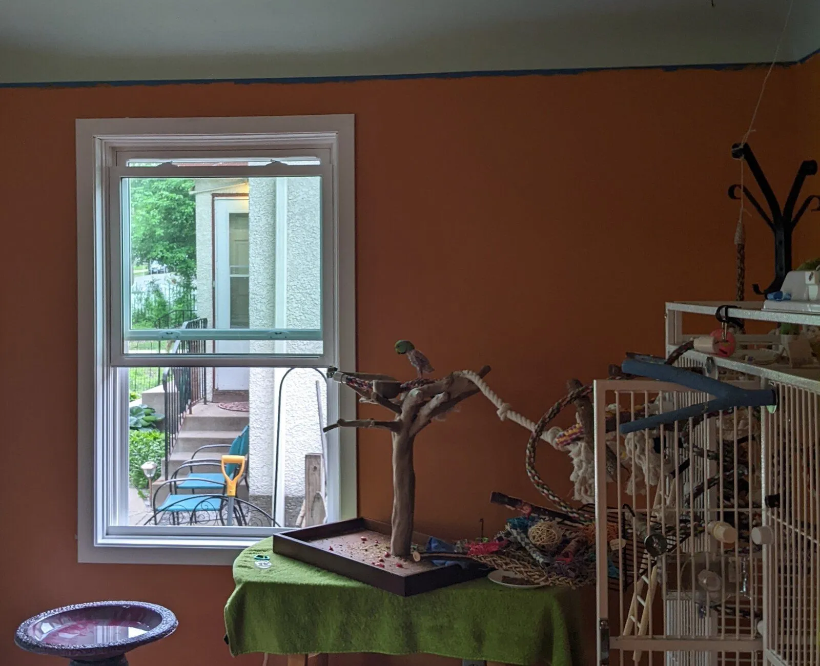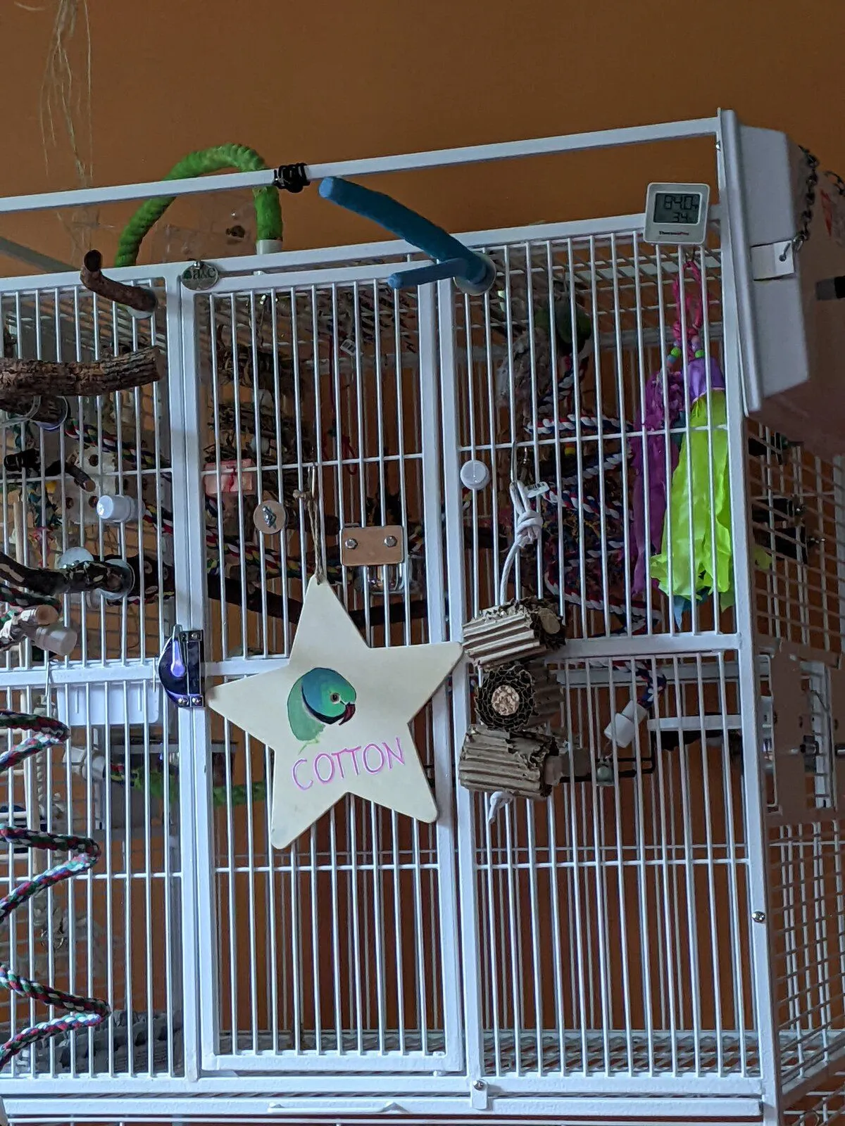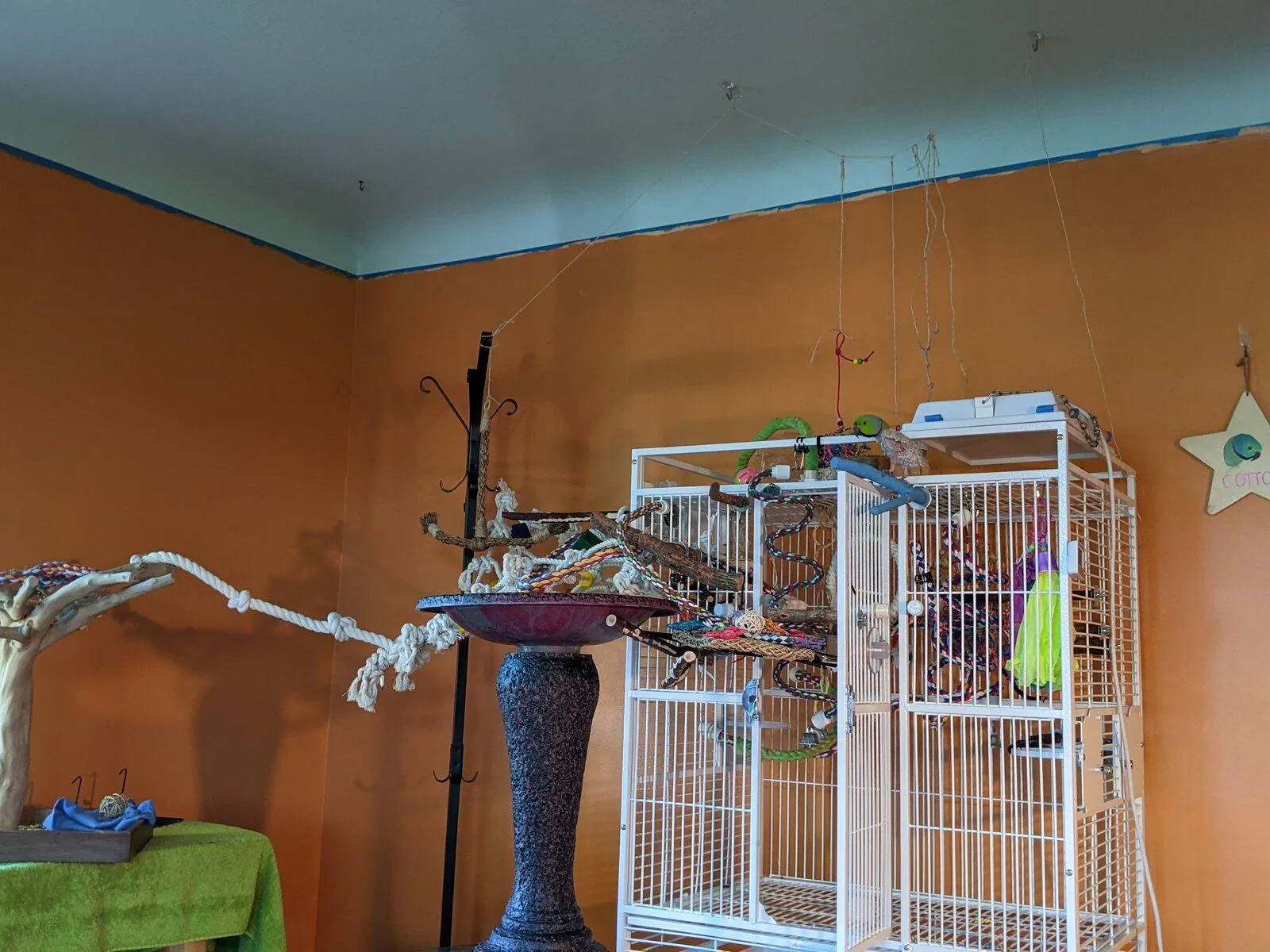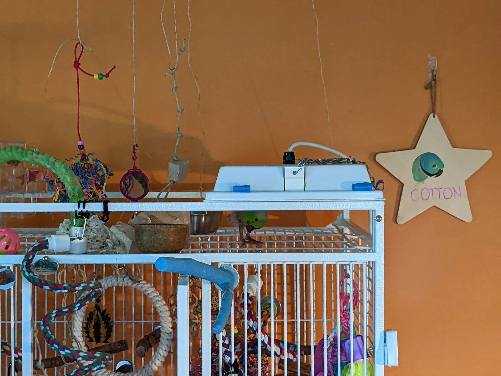 I moved a few things just now to give him more toys and a better perch by the window, so he's on top of his cage playing.