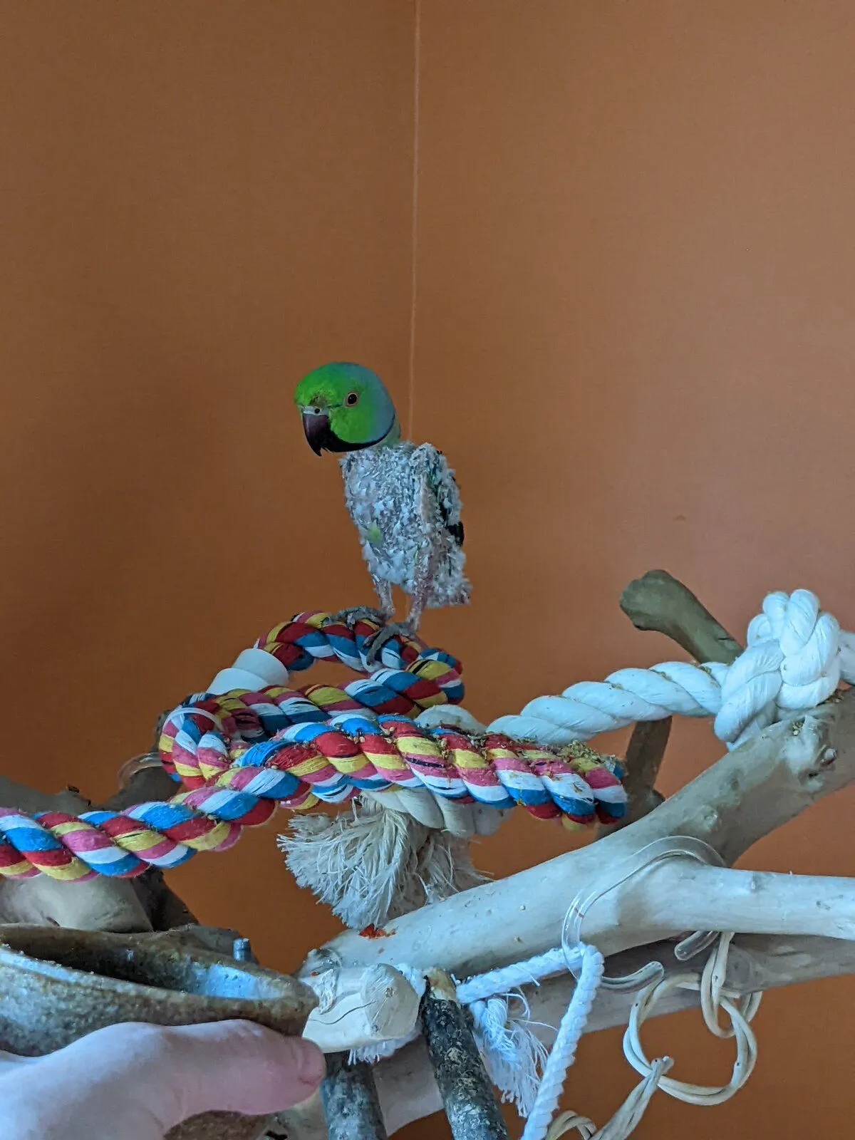 I let him out before setting his food bowl today and didn't expect he'd already be at the window talking to the birds outside before I had his food ready! I talked to.him the whole time I was bringing the bowl over (he was standing RIGHT where it goes at first) and he let my hand get so close! The sound of it going onto the stand scared him though and he scrambled back to his cage for a little bit, making a big show out of preening and staring at meI pretended not to watch but was totally spying on the camera, ha.
