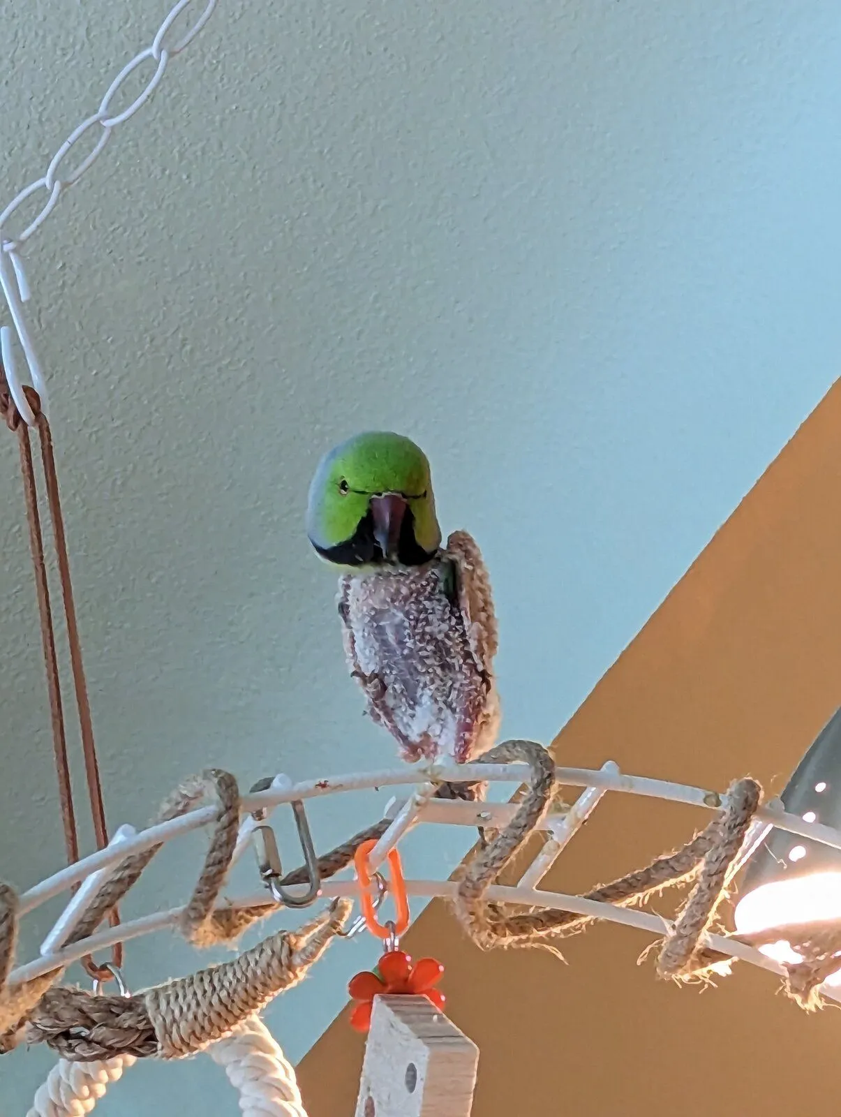 - Fang ({ab}normal grey cockatiel), Valentino (budgie), Jem (cinnamon cockatiel), Lovejoy(varied lorikeet), Peach (princess parrot)