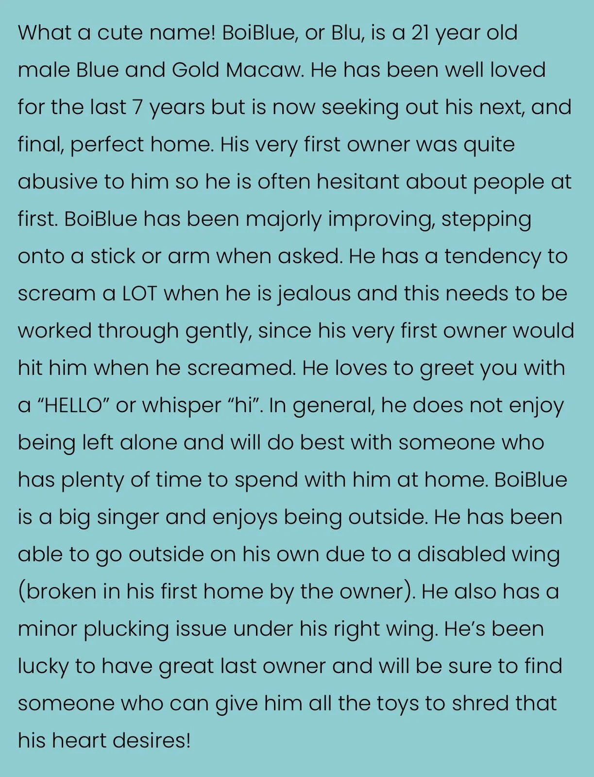 This is his back story from the shelter. They did inform me that he broke his wing when he was hit by a broom. Nico has a broken wing as well but it doesn’t appear to bother Nico. Blue seems really bothered by his broken wing. He sticks it out a lot, and rests it on perches. I’m curious on what his options are if any.