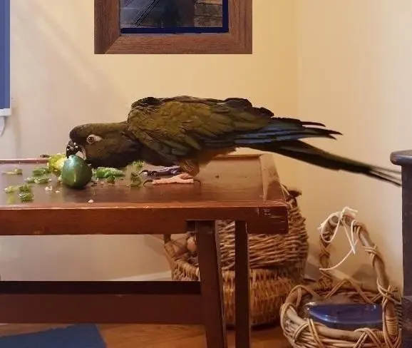 Please meet my Patagonian Conure, Rickeybird. He is 39 years old this year, and has thrived on Harrison's foods since his first year of life. My avian veterinarian recommended it at the time, and we've never turned back. He loves Harrison's almost as much as he loves his super-hot green chiles.