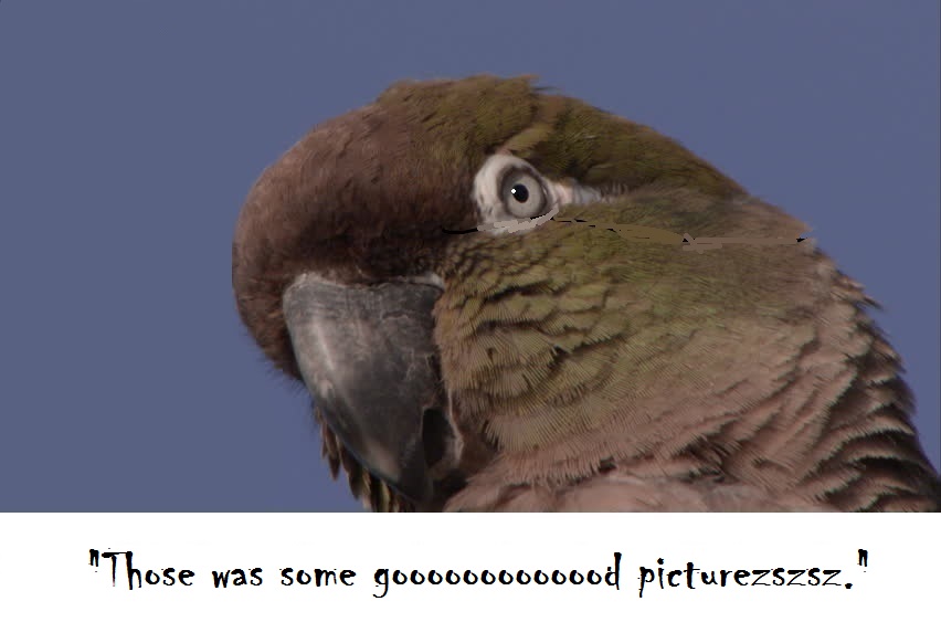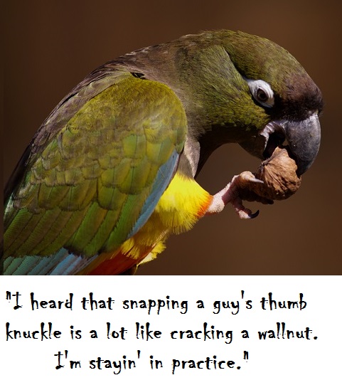 We could call it "50 Shades of Nigel". Nigel pontificates on the virtues of manners, fine food, and the company of genteel hens, but he has a secret stash of sunflower seeds, handcuff leg-bands, and pictures of hens in leather harnesses. His butler (let's make him a nosy little Severe Macaw; they just LOOK nosy to me) finds the stash, steals it, and threatens to go to the tabloids. In need of some 'special services' since he hates to get his hands... er... feet dirty, Nigel engages the Rickeybird to sort things out. The Rb has a surprise 'meeting' with the butler, resulting in chewed up Severe tailfeathers, a very rattled little macaw, and full recovery of the stash. Nigel agrees to let the Rb keep some of the photos of "hott hensz what knows how to partty", and the two unlikely associates part ways until... next time...