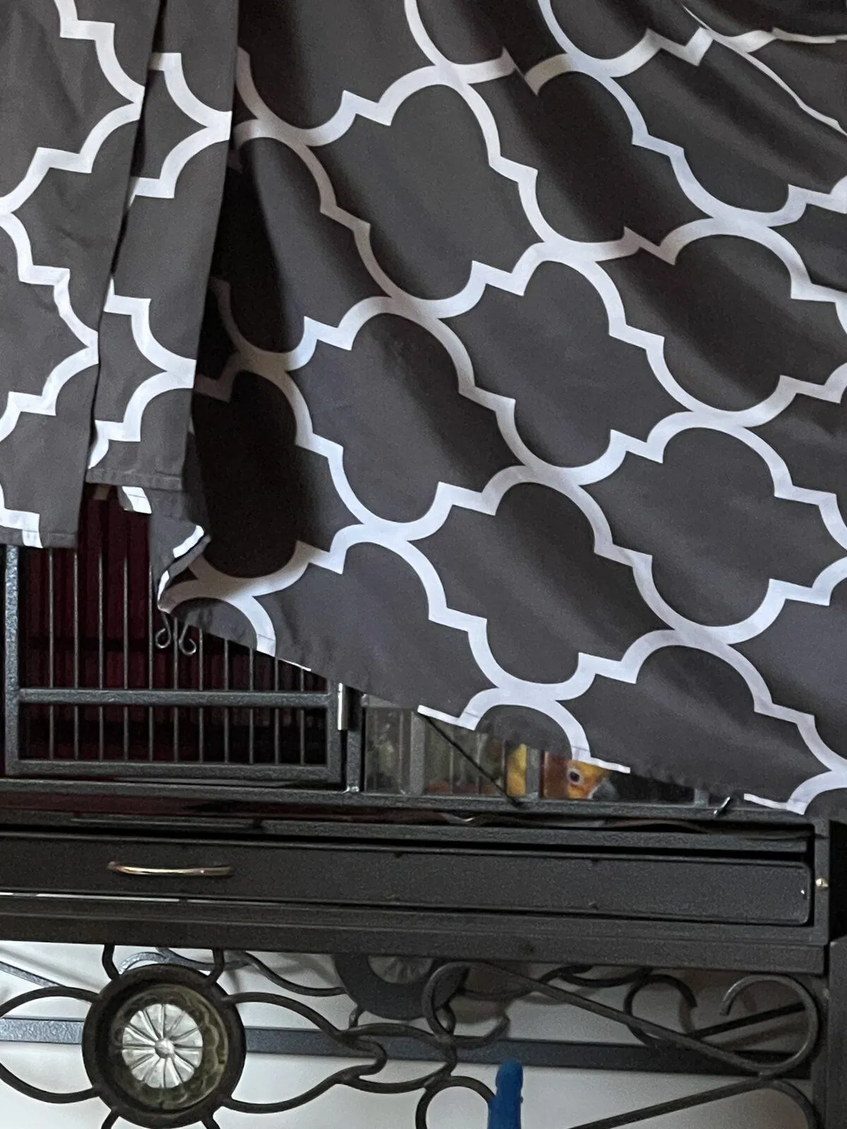 Vets suggest covering parrots so they can get a full 12 hours of sleep uninterrupted. I understand the purpose to this. I leave a little of the bottom uncovered. Well… Kiwi the conure then plays peek-a-boo. This is a fun game to her. What can you do? Birds will be birds