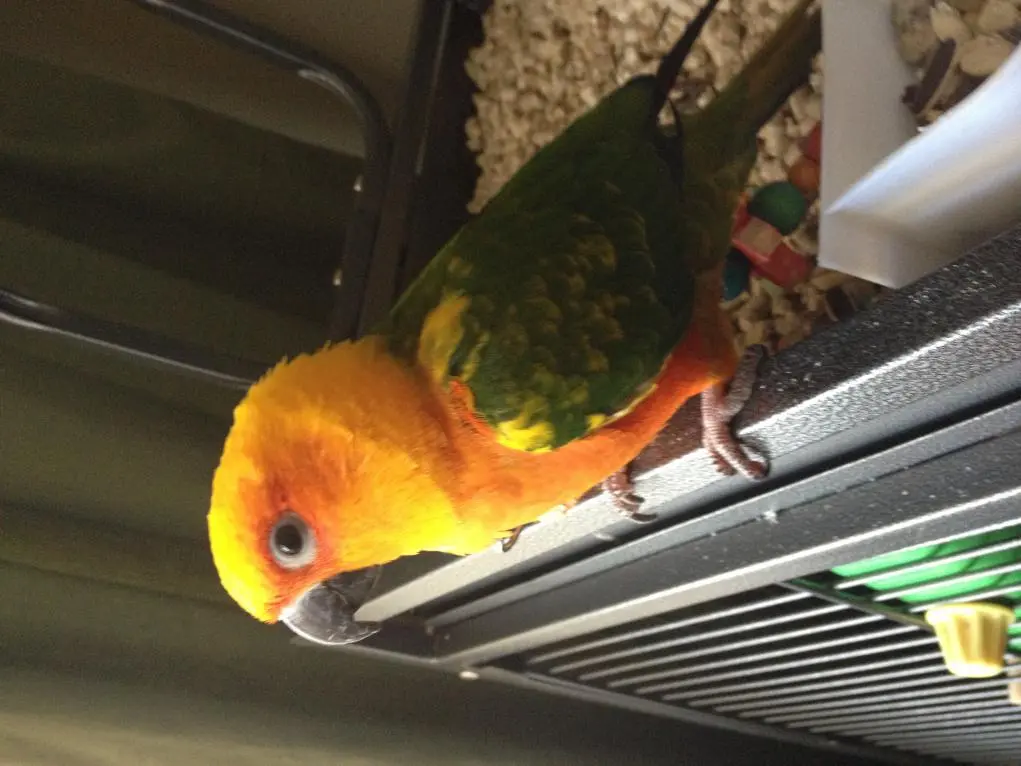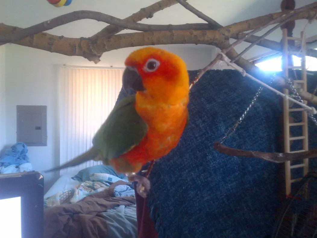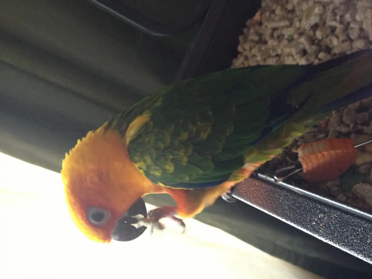 Left is a Sun (Barker) and right is a Jenday (Con). I would say you're the proud owner of a Sunday/Jensun conure. You can tell (usually) a hybrid from a normal by their wings. The yellow spots do not occure on Jendays but a Sun conure's wing is most yellow so that's how the yellow gets there.