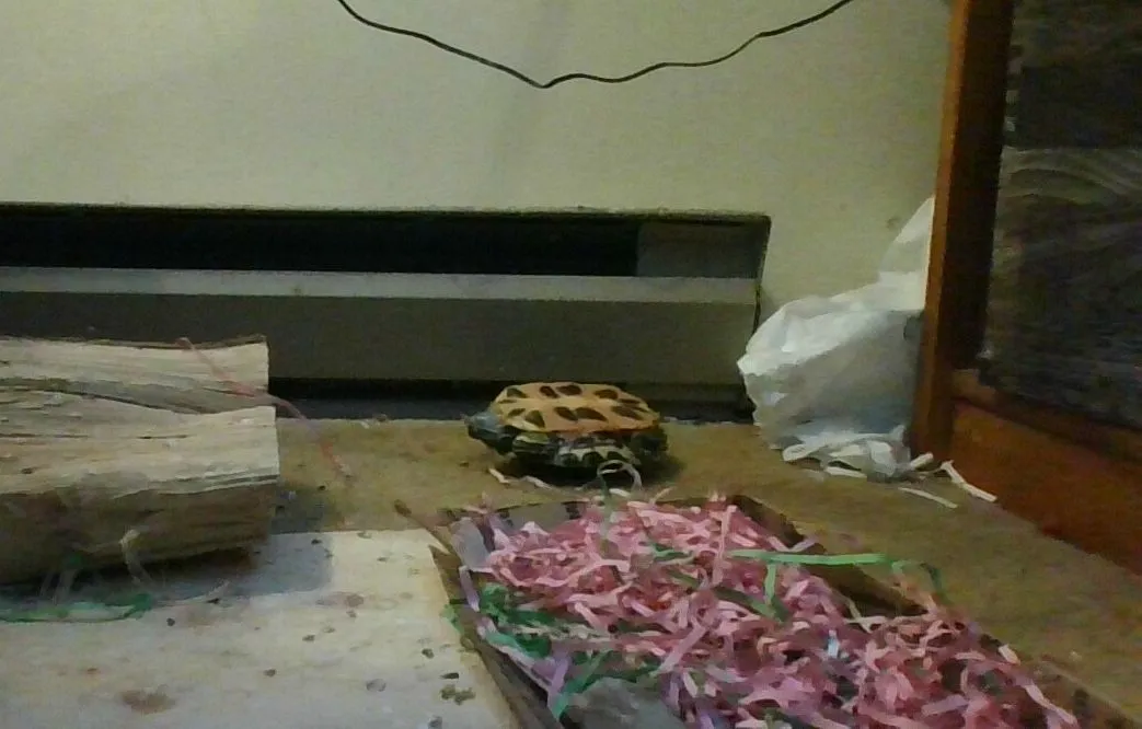 She is in a 150 gallon tank with lots of natural plants (she loves to pluck them out) and has this rock cave with dry land over it and a UV light