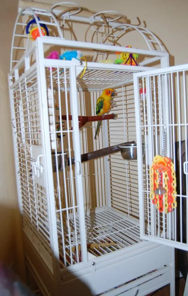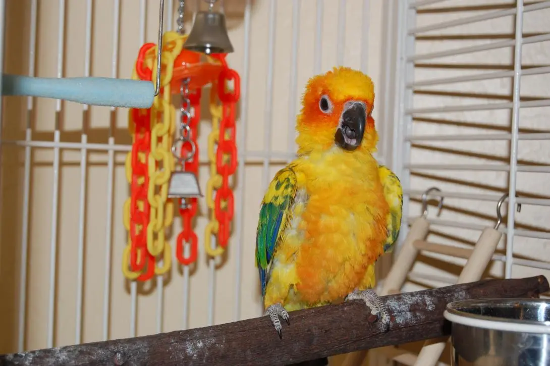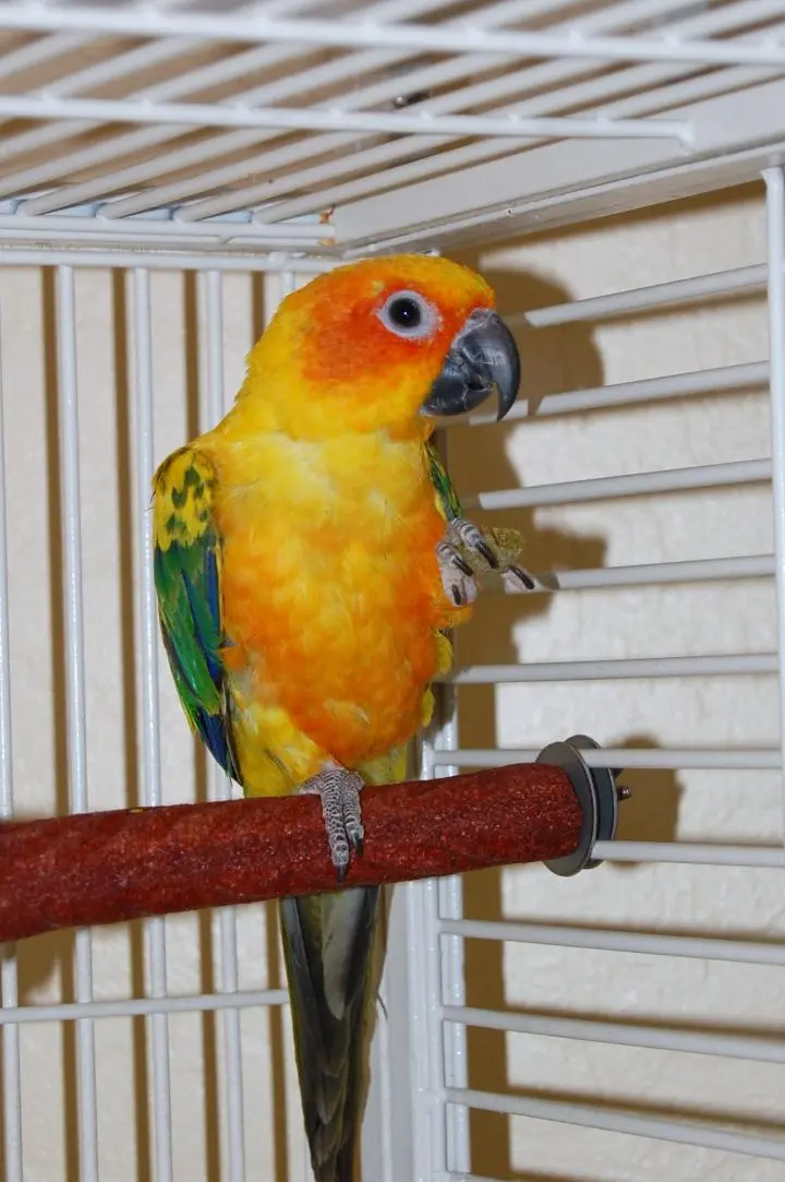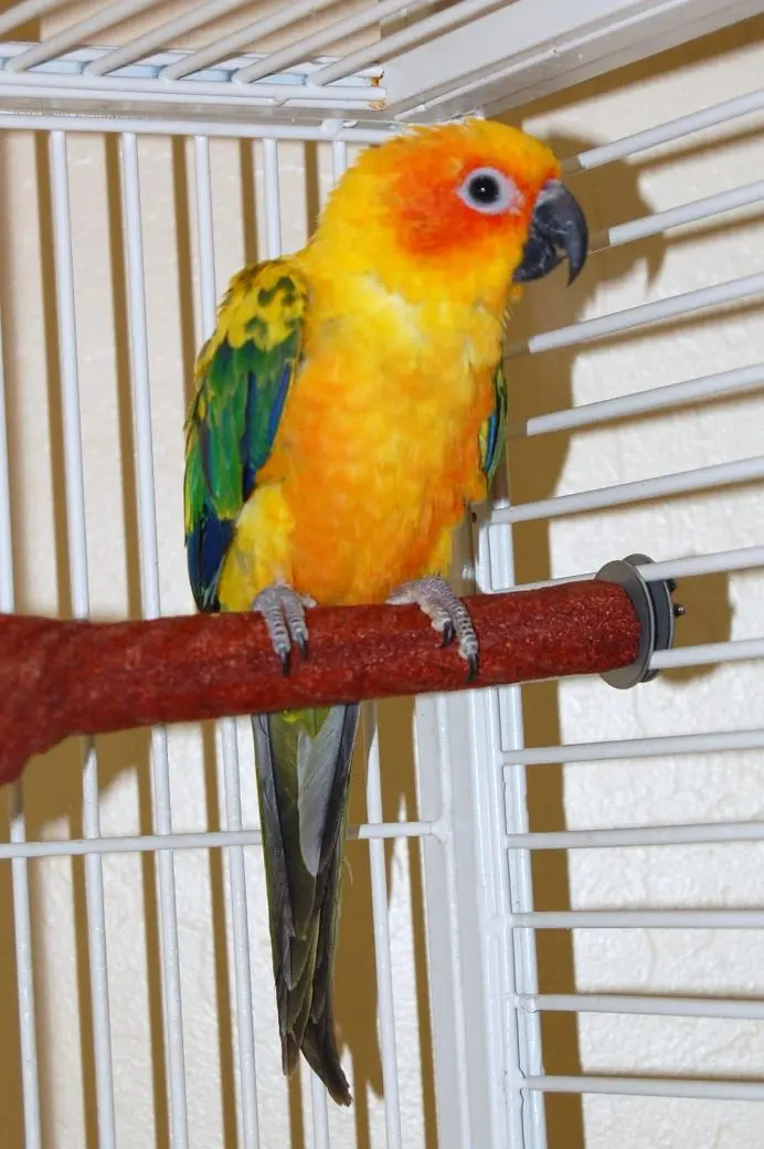 she clings to the side of the cage for most of the day. she has a very thick perch the cage came with and rarely stands on it, so im thinking maybe she doesnt like it and needs new ones. she climbs around all of the bars and plays with her toys though. she squaks and chirps, kinda sounds like a goose lol. she has a swing perch in there but hasnt got on it yet, just chews it and swings it around with her beak.
