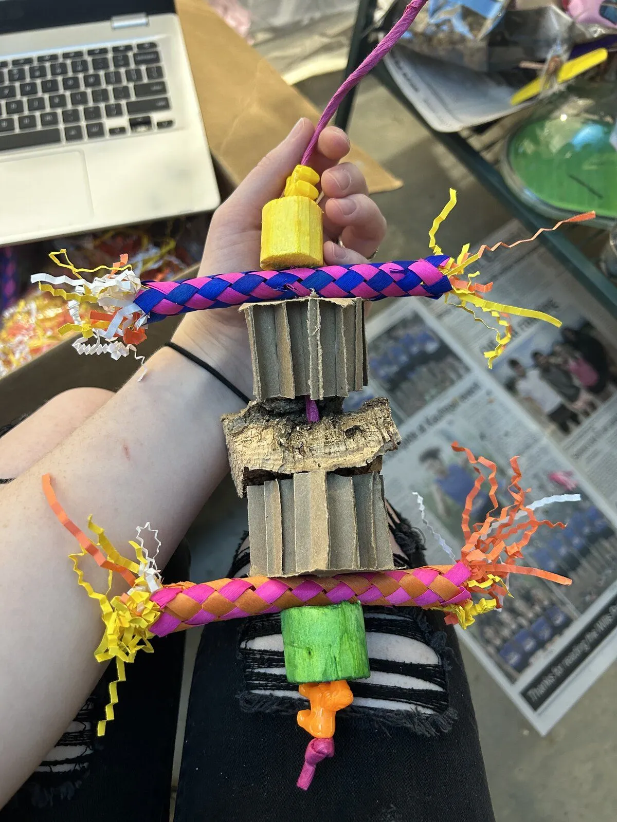 Made one for Tom and for Tony, sola, cork bark, cardboard, animal beads, and crinkle paper!