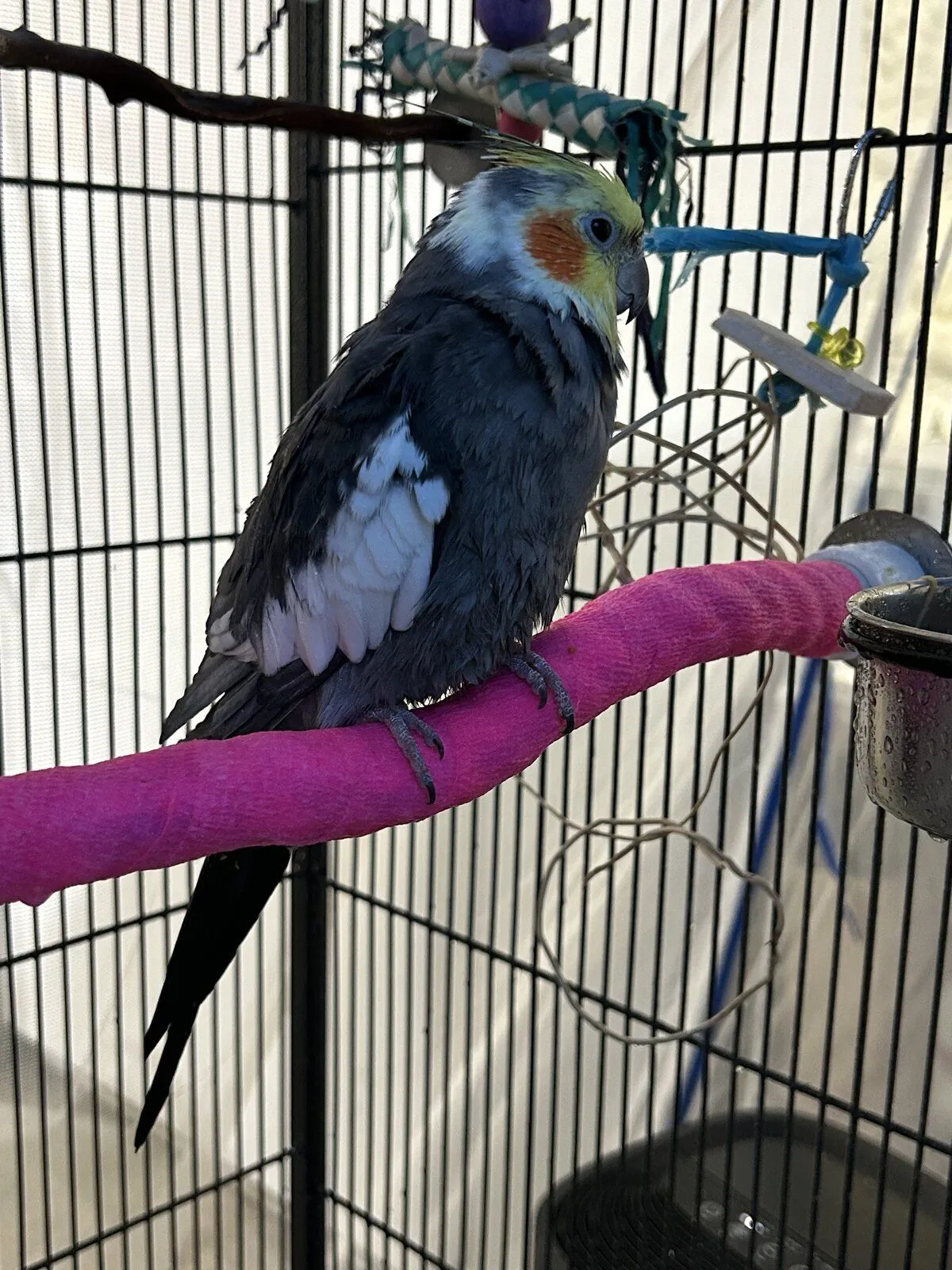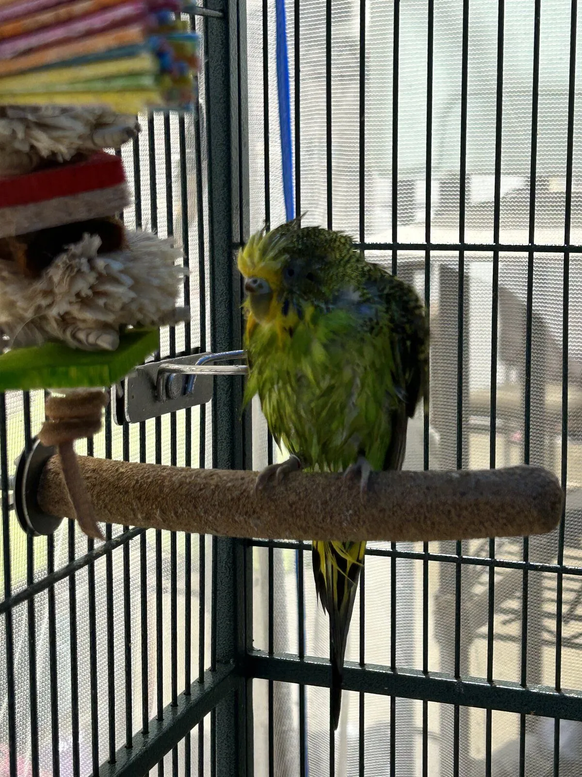 Usually the budgies don’t get soaked when bathing but Hedwig decided to!
