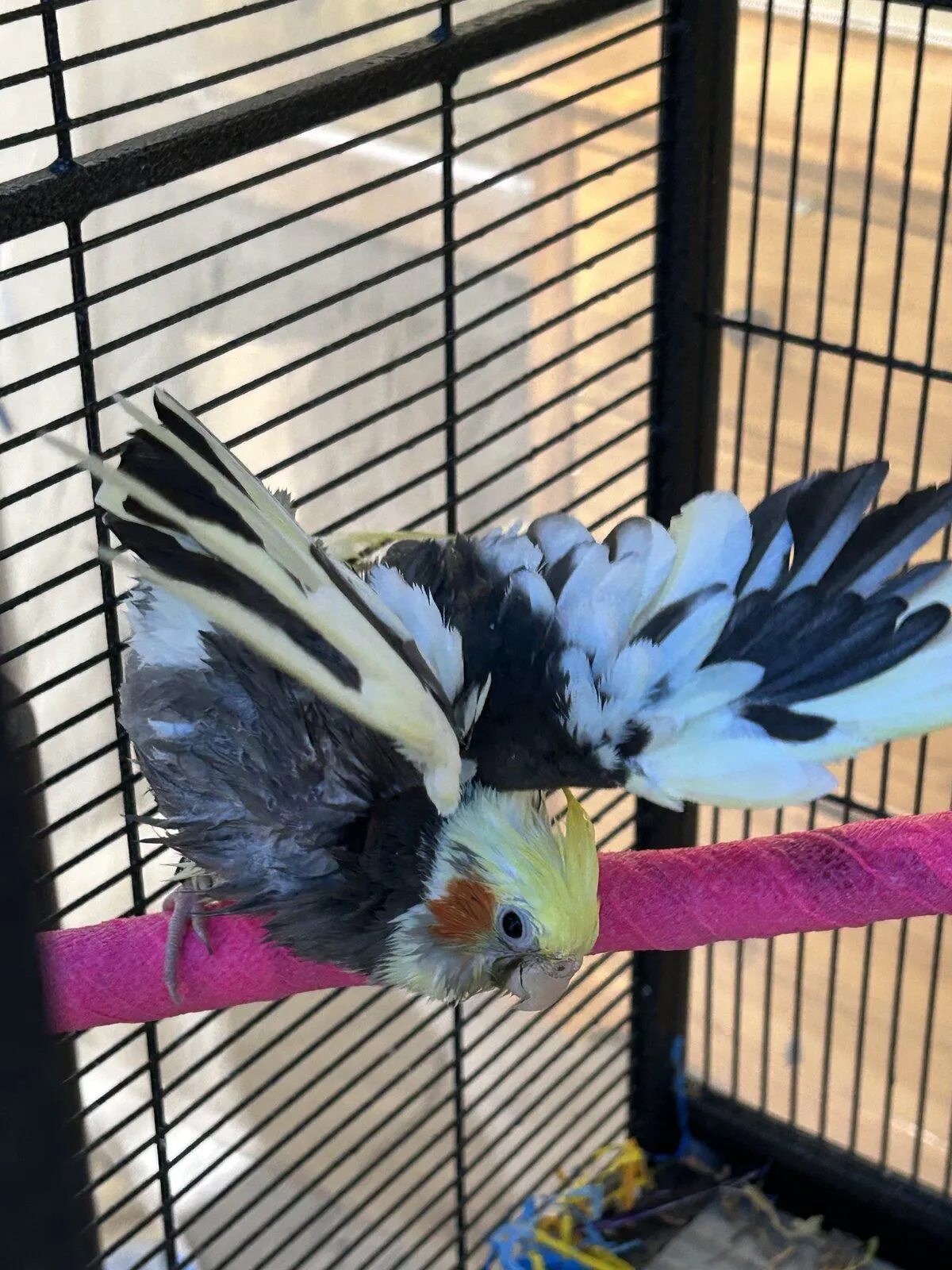 When he wakes up from a nap, he stretches each wing.Oh my is this Tom’s version of “the pretty pose” Ona loves to do?!