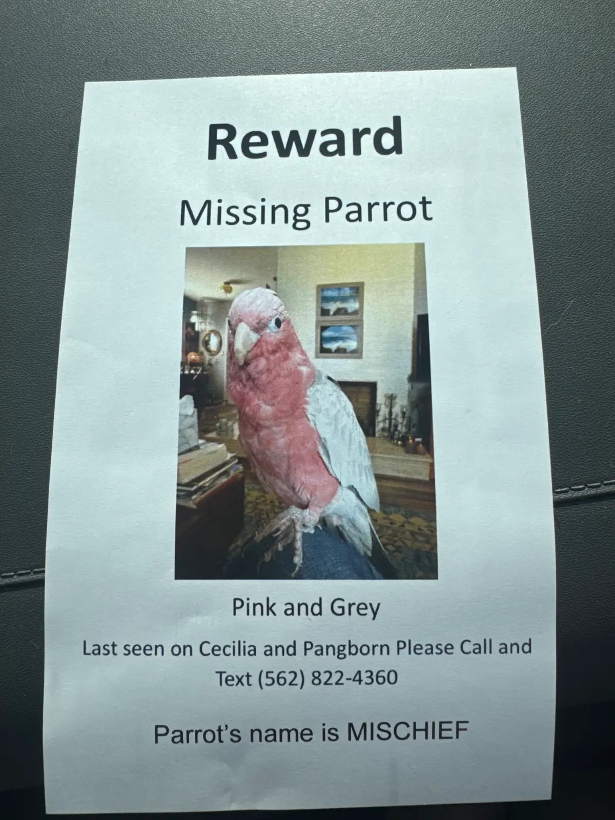 We’ve taken several steps for her safe return, some of which I’ve already discussed. We’ve put her cage in the front yard, her big perch in the backyard, and her small perch on the roof. We have reflectors to deter hawks from attacking the chickens we sometimes foster but we took them down to avoid confusing her if she flies over. We’ve put posters all over our neighborhood and other neighborhoods in our general area. My mom, Dad, and I have spent most of our time since Tuesday walking around and calling for her and using her clicker (she was being trained to associate the click sound with treats). We handed out flyers to every person we saw walking. We made a Facebook post, a Ring post, and a Next Door Neighbor post. I work at a school, and while it’s unfortunate I can’t afford to call off again to look for her today, I’m handing out flyers to each teacher I work with and am requesting they share the information with their students, while also discouraging prank calls, as we’ve already gotten a few. One person tried to scam us and sent us a picture of a bird that definitely wasn’t her and was one they found online. It broke my heart to see a Galah that wasn’t her and think about never seeing her again. We’re also keeping an eye on local listings to see if someone finds her and tries to sell her. If anyone sees anything, please message me.