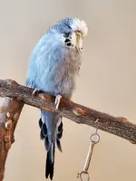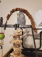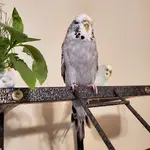 Mauve, the gray English, has a big story and I want to share. My partner and I were browsing a local reptile pet store for a new tortoise, and entering the building I found a bird set up before any reptile enclosure. A bit shocked, I stopped by and saw her - Mauve. I had expressed that one of my two dream budgies was a gray colored budgie, so I was immediately already drawn to her. I looked into her eyes and felt her name. I instantly loved her. I slipped my finger through the bars and she walked over and kissed my finger. She looked at me in the eyes and puffed up.