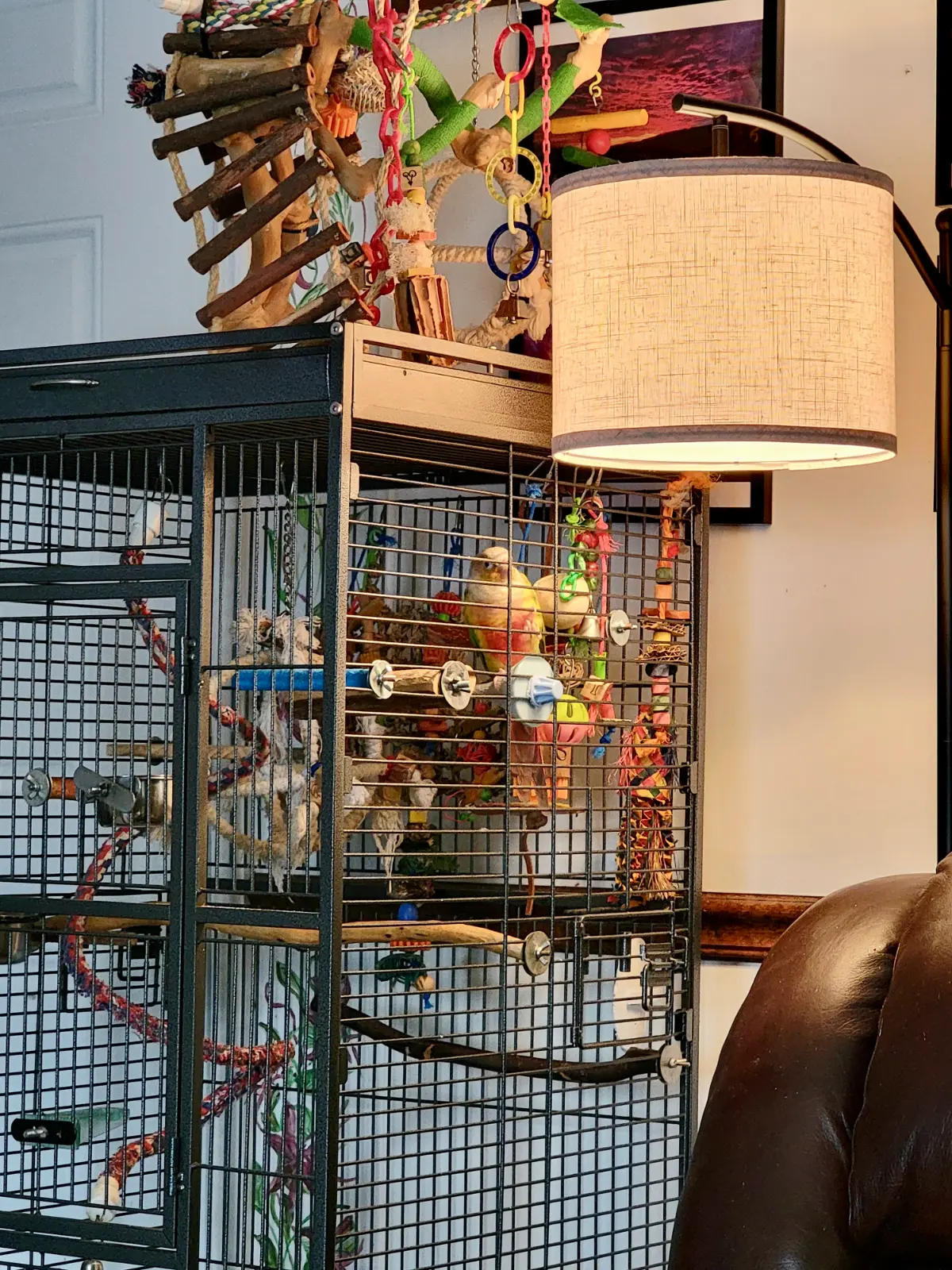 However, his cage is in a dark area of the living room and I wanted to give him some more light. I purchased a floor lamp with a shade. It has a 60 watt bulb which is adequate for lighting up his area.