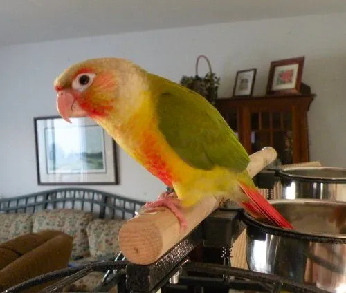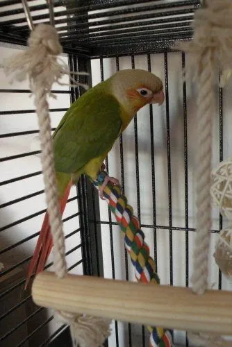 While my daughter and I were in our local bird shop buying food, we walked into their aviary as usual. Sitting on a perch was the most beautiful pineapple GCC! My daughter picked him up and he immediately made his way up her arm to nestle into her neck. He's almost 2 months old, and he makes the cutest little baby chirps you've ever heard!