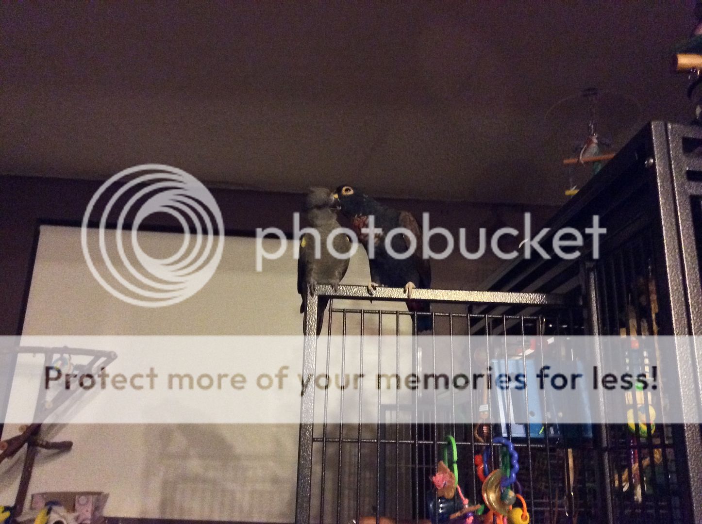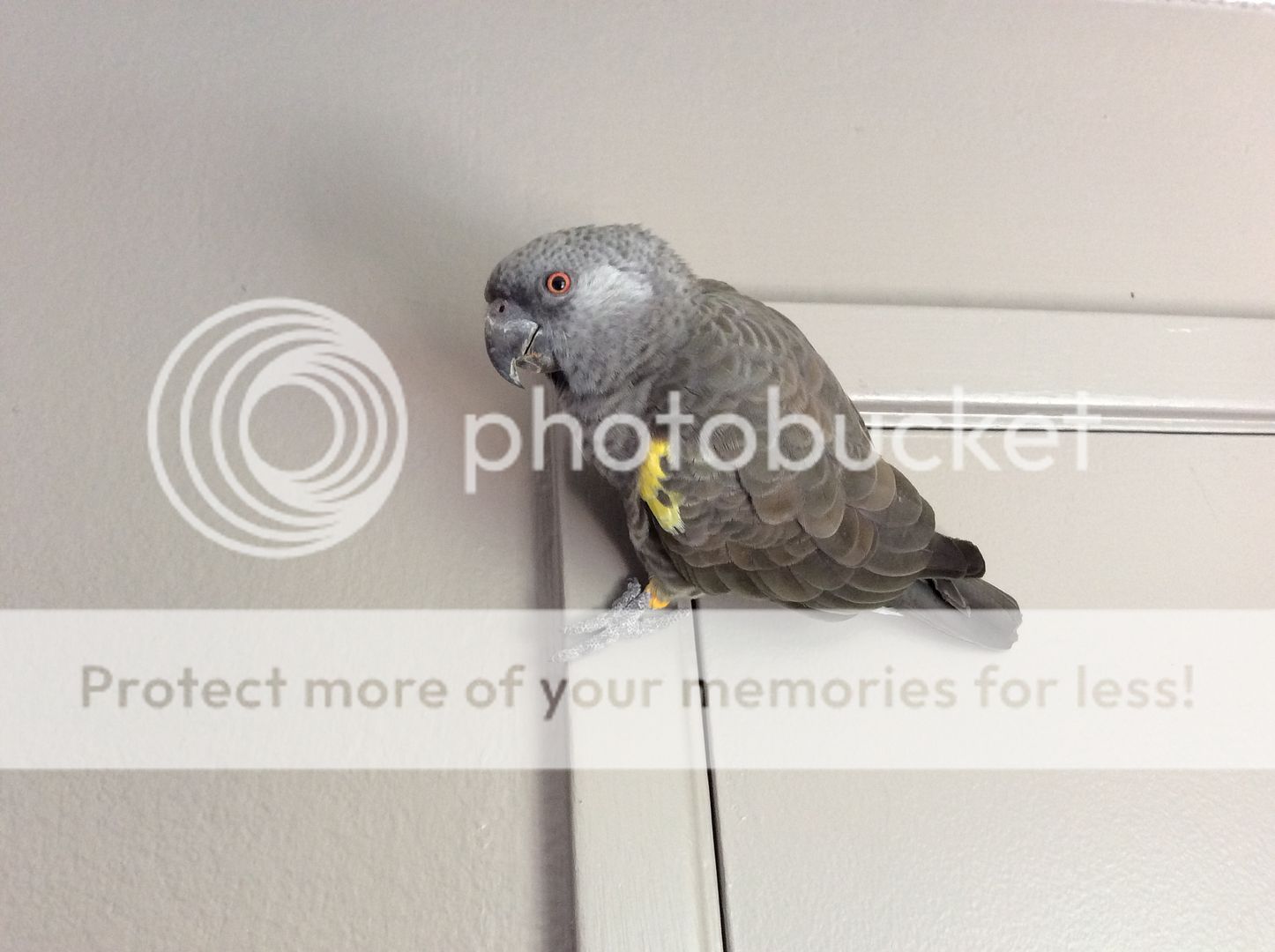 When I went to check on the birds, this is what I saw. He likes to sit on top of doors, which I don't like, but of course he figured out an alternative.