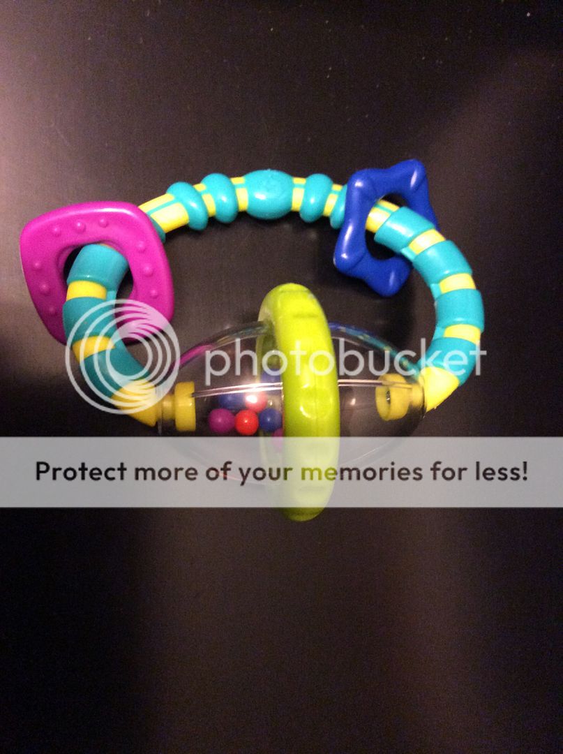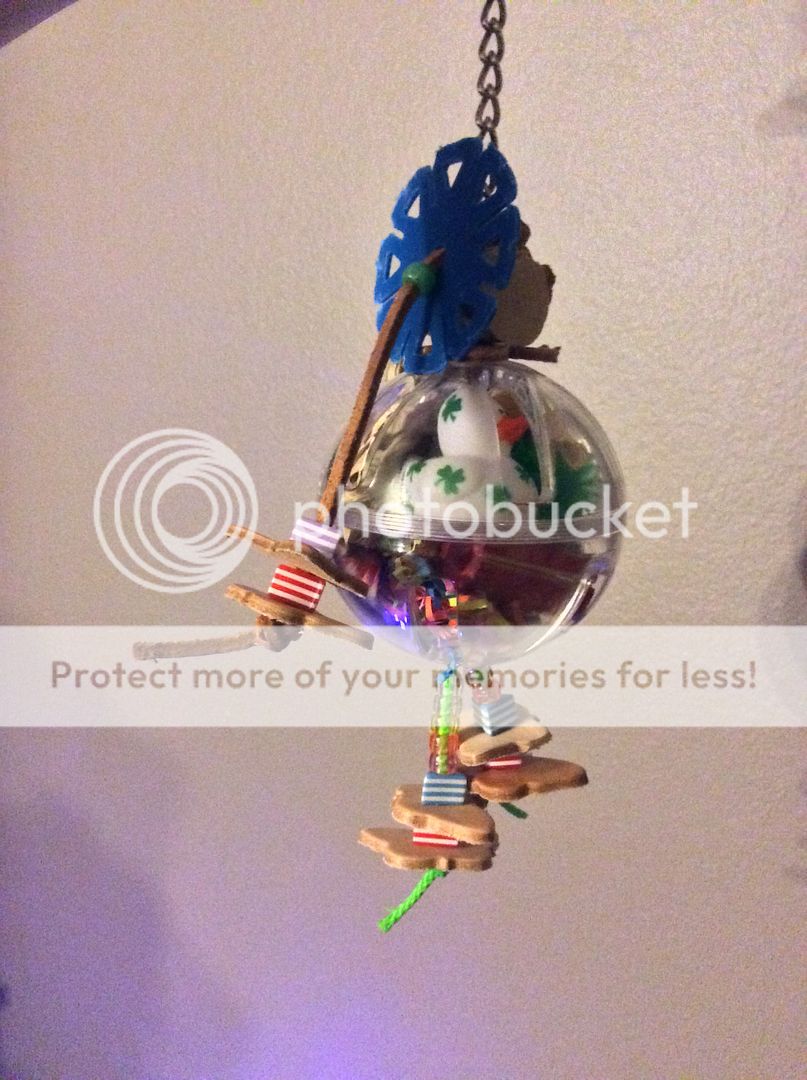 For his presents... First, I refurbished an old favorite toy. It's a refillable foraging ball (I love this) and it is stuffed with about 15 items. It's a bit larger than it appears in the photo. Plus I decorated it with the things hanging on the outside. This boy needs to be kept very busy! He also got a 'baby toy' rattle that is an out of cage supervised toy.