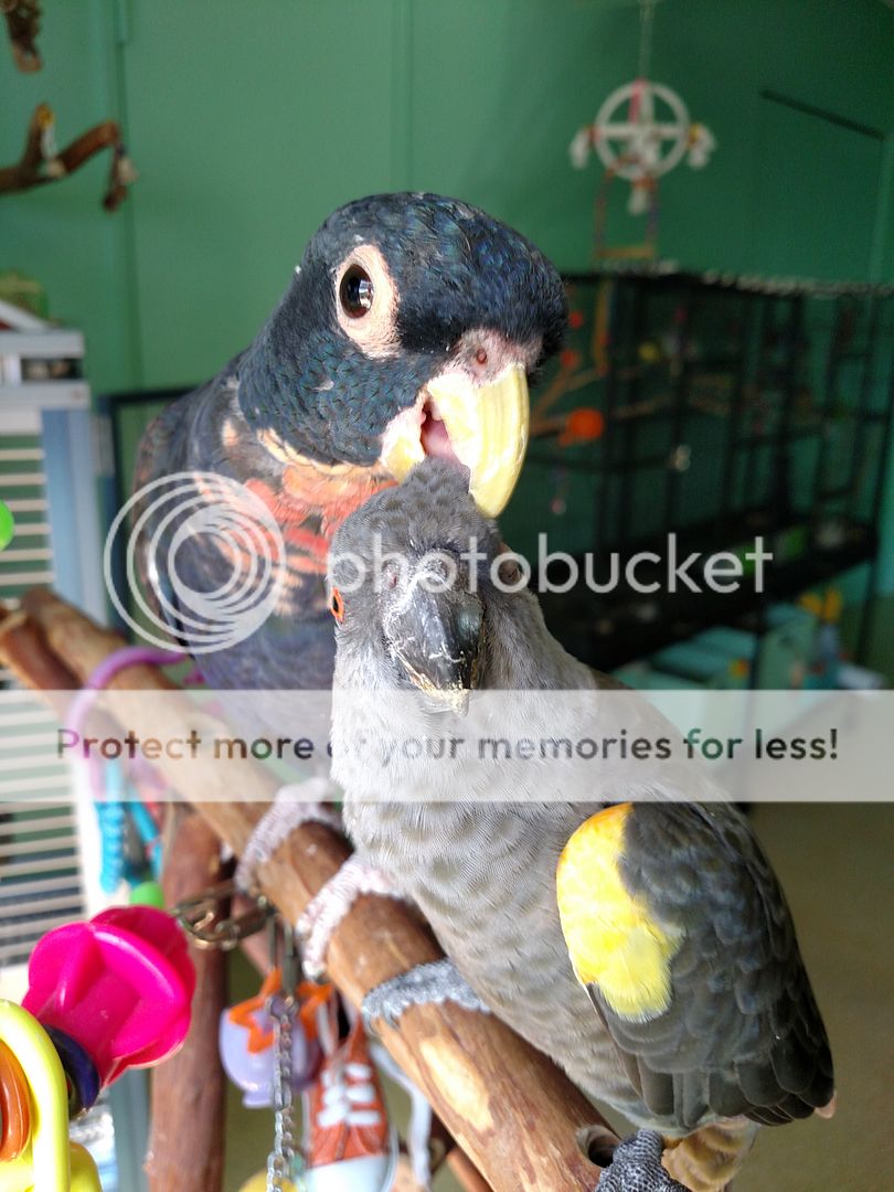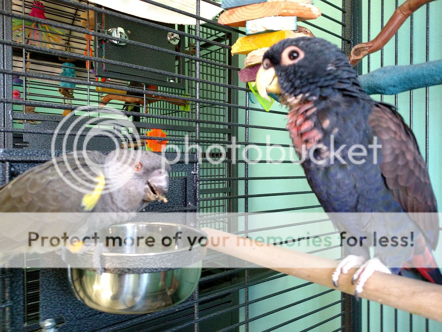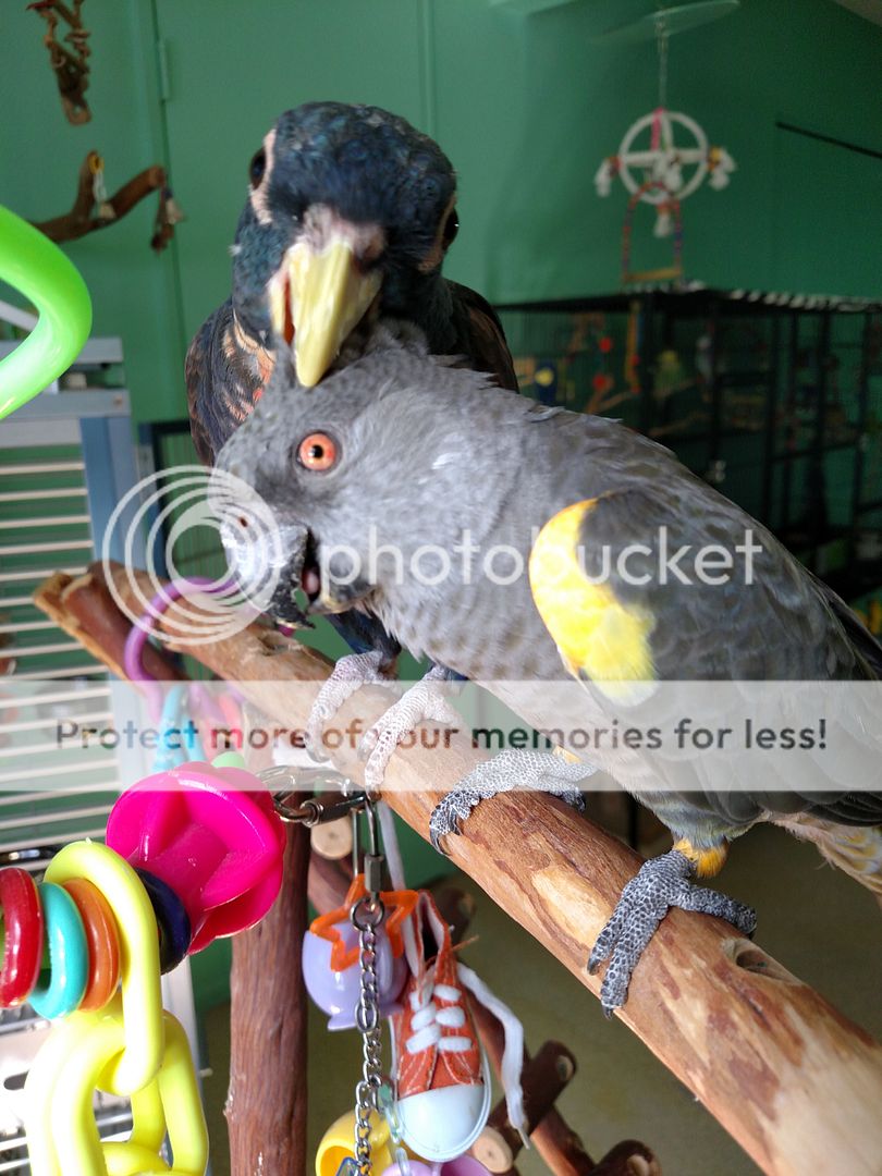 This morning, Raven invited Griffin to his house for breakfast. When Griffin flew in, Raven immediately said "hi!" I told him to say happy birthday, but "hi" was the best he could do lol. Then he started feeding him (yuck, Griffin can eat just fine on his own!), Then Raven started preening him. Griffin is lucky to have such a good bff.