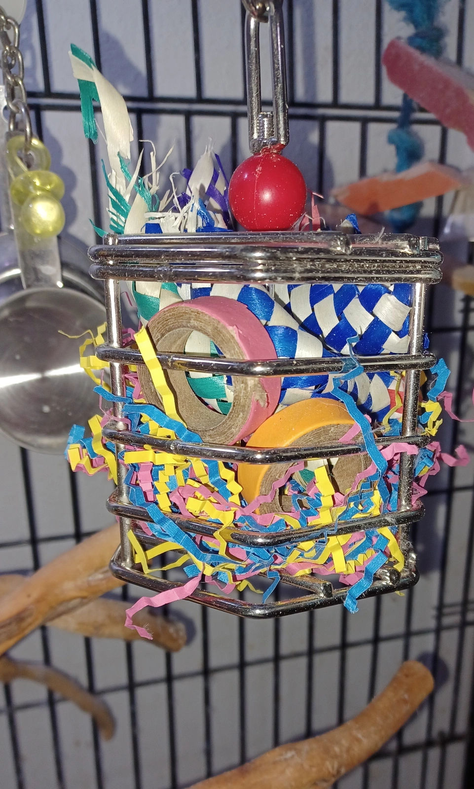 I’ve thought about getting one of these several times, but haven’t done so yet. It seems like it would be good in a pinch, as you can just throw whatever you’ve got on hand in it! It’s nice to hear it has a good review from Nameliss!My CAG is usually a disassembly expert. She can be destructive. I usually use various 'twine' like material that I thread toys on. Her main love is disassembling toys. She loves her baffle balls. But they don't last long. I saw similar 'cage' posted here on another thread. After searching I found it. Easy to fill with toys (or food). Easy to clean. I call it the whatever. Whatever I feel or have goes in. Items are ranged from easy to you-gotta work for removal. I have used cardboard or paper rolls. She spends a lot of effort trying to figure out how to open this. Such a great way to engage that mental energy!View attachment 81685(stainless steel baffle cage from bongka bird toys, 2 sizes available)