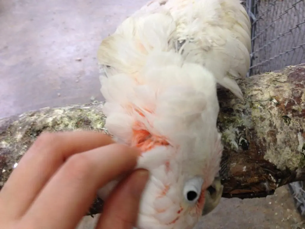 She whispered " Oh My Gosh it's bleeding." I was still paying attention to Dolly who was following me down the side of the cage. I was crouched, trying to feed a grape off the ground. When I looked up my soul froze. Therein front of us was a clean plucked mutilator, with blood dripping down her bare chest, from a gashin her throat, an inch long, a few millimetres deep.