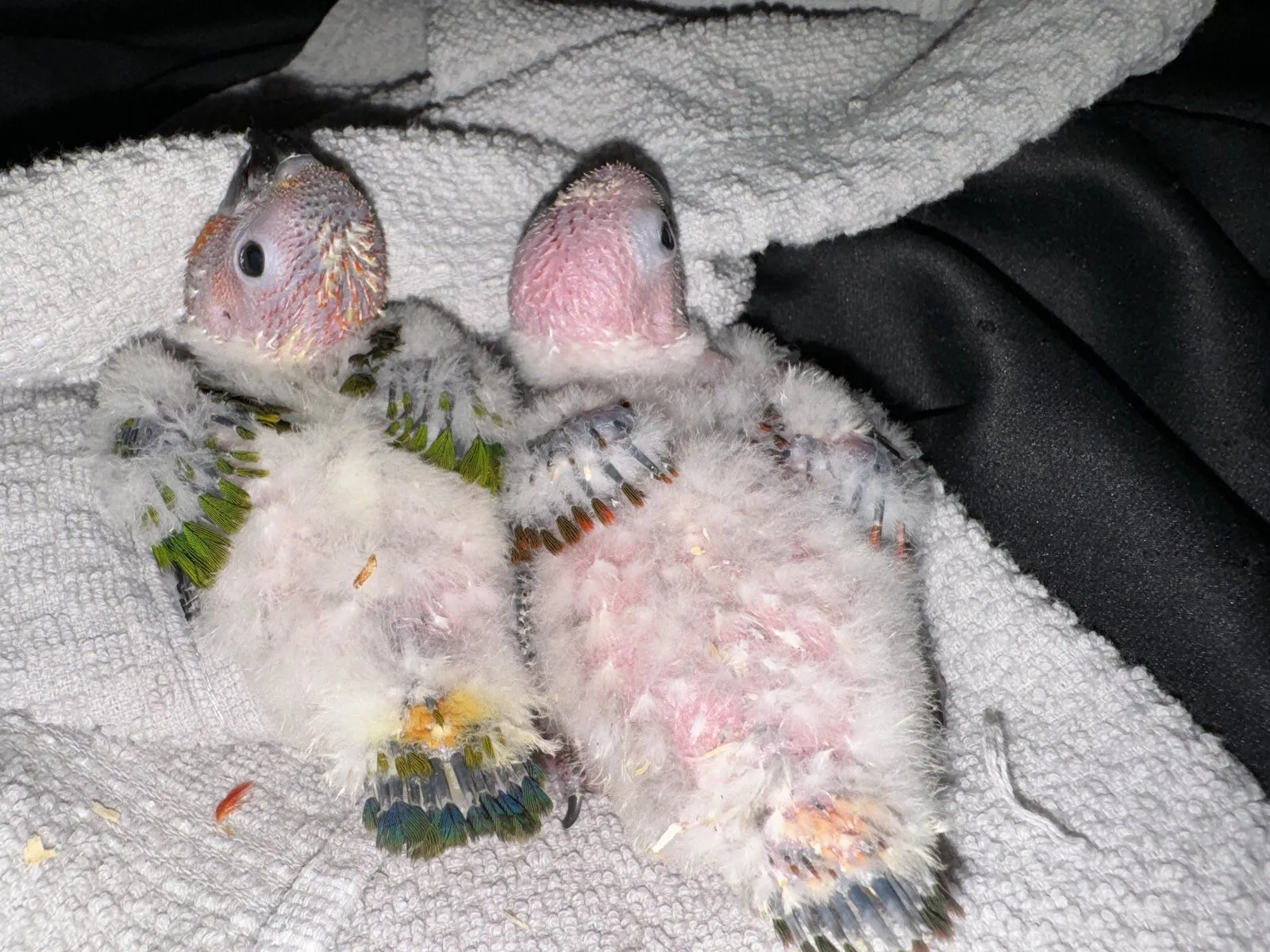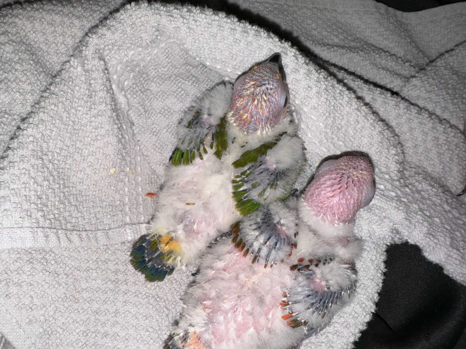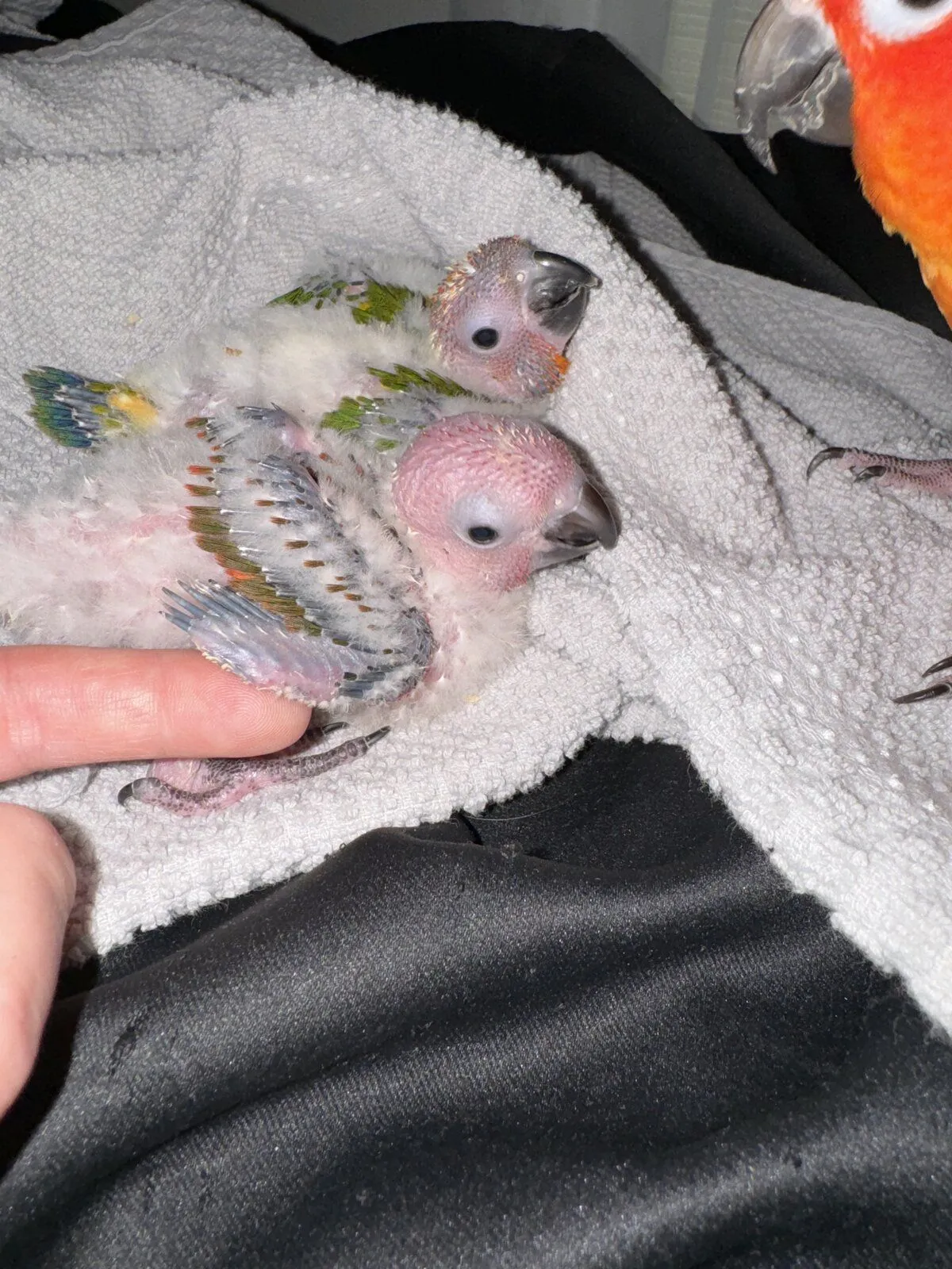 My sun conures laid eggs again this year. They laid four but only two hatched. The babies are starting to get their feathers. Iām a bit worried one might be a bronze baby. Iāll have to wait a week or so to tell. Iām hoping itās just a high red factor. If you look at the wings it looks red and green not blue like a bronze. Only time will tell. Itās the baby on the left that Iām worried about.