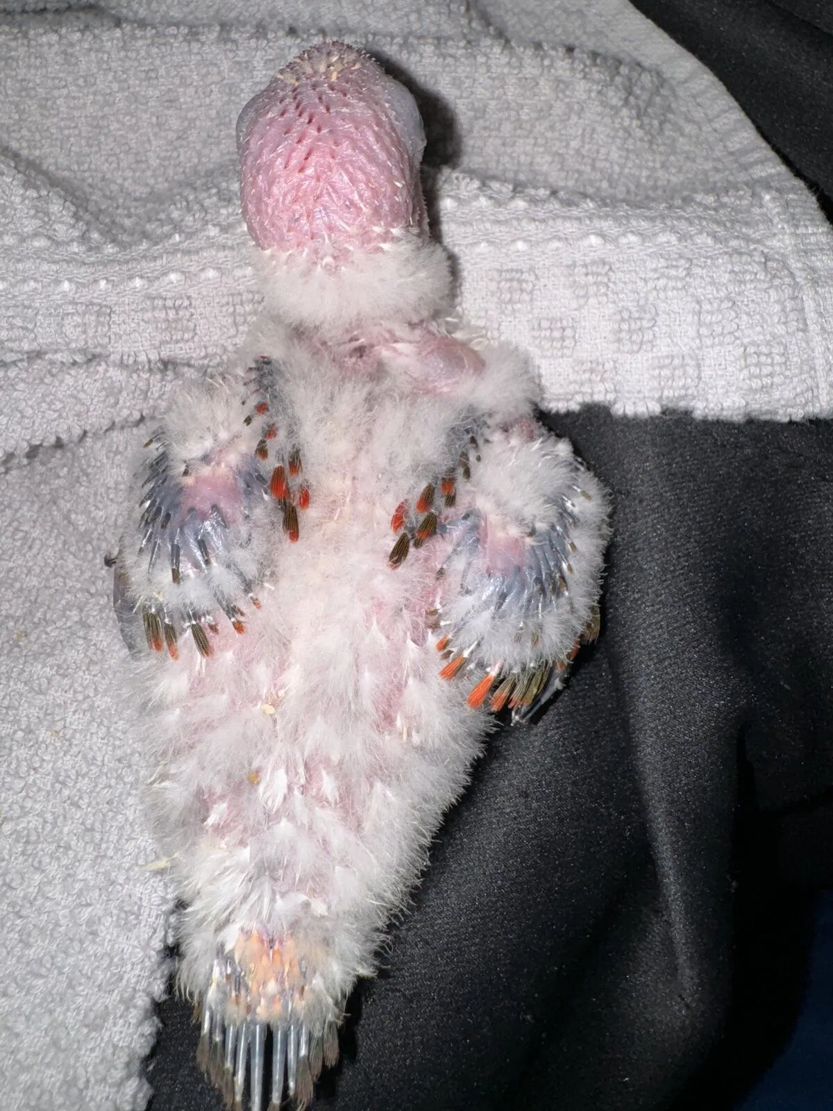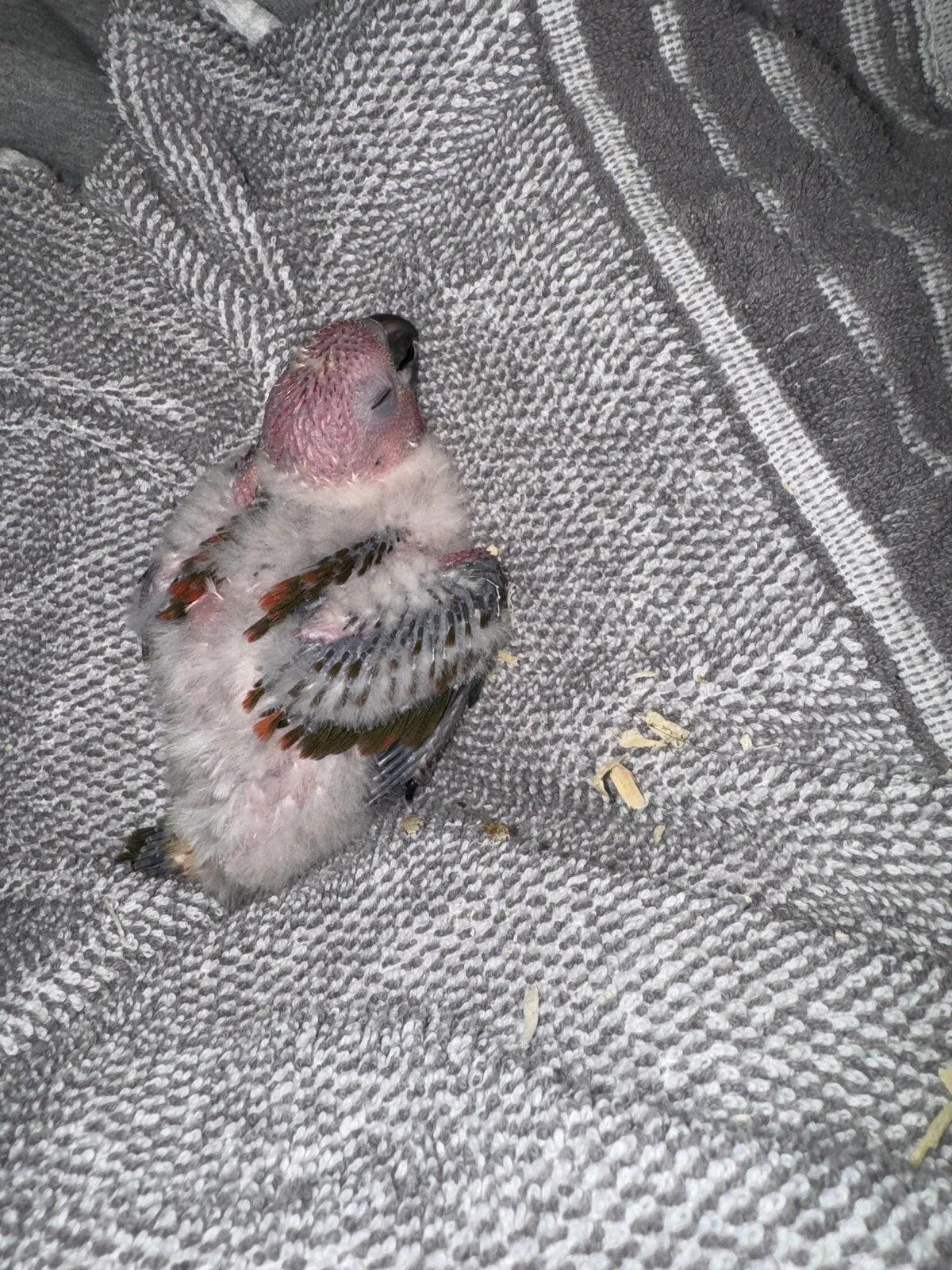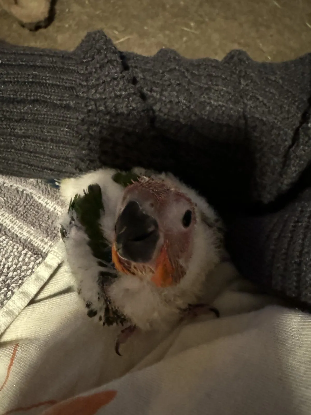 My sun conures laid eggs again this year. They laid four but only two hatched. The babies are starting to get their feathers. Iām a bit worried one might be a bronze baby. Iāll have to wait a week or so to tell. Iām hoping itās just a high red factor. If you look at the wings it looks red and green not blue like a bronze. Only time will tell. Itās the baby on the left that Iām worried about.