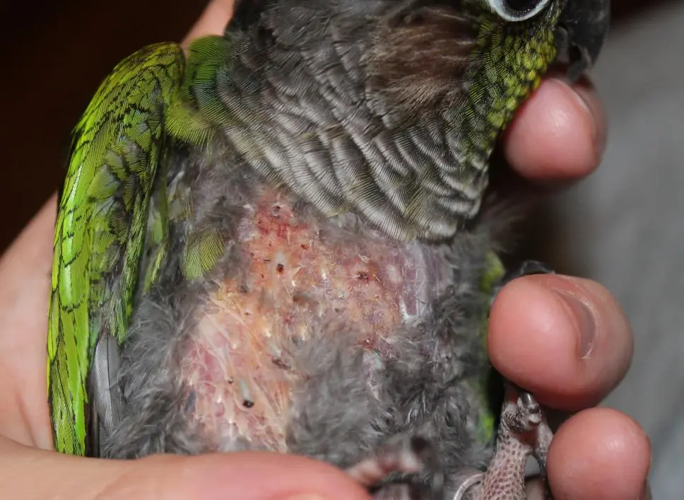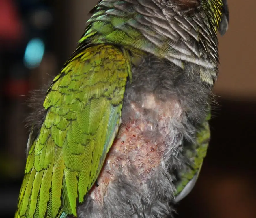 I'm not sure what is actually happening here. My GC Conure, Roxys, chest was covered in Grey Downy feathers, but now has splotches that look raw and painful. She's been agitated lately, so I think she may be plucking. I'm Worried, and I'm not sure what this is, if it's normal (I don't think it is), and what I can do to help her. Any Information, and/or suggestions would be much appreciated! Thank you sooo much!!