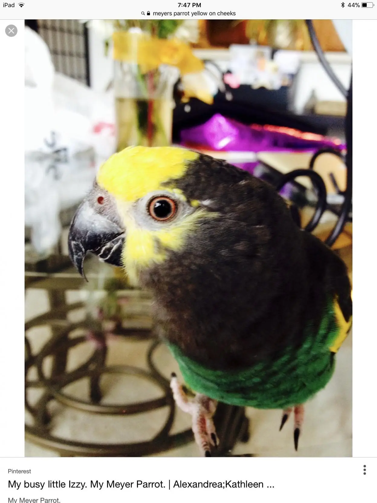 I have owned a parrot for the last 15 years. I believe he was about 6 years old when i got him. He was given to us by my aunt who had a busy house with kids, cats, and dogs. This didnt leave much time for Snickers. After having him for all these years, my fiance and i debate over what kind of parrot he is and my aunt doesnt remember. Our best guess is meyer, mealy senegal or a cpl of others but when we look at other pictures, there is always something off. For example most meyer pics have full gray heads or his rottweiler (orange color) eyes dont match. So we have decided to come to the experts - what kind of parrot am I? Pic attached