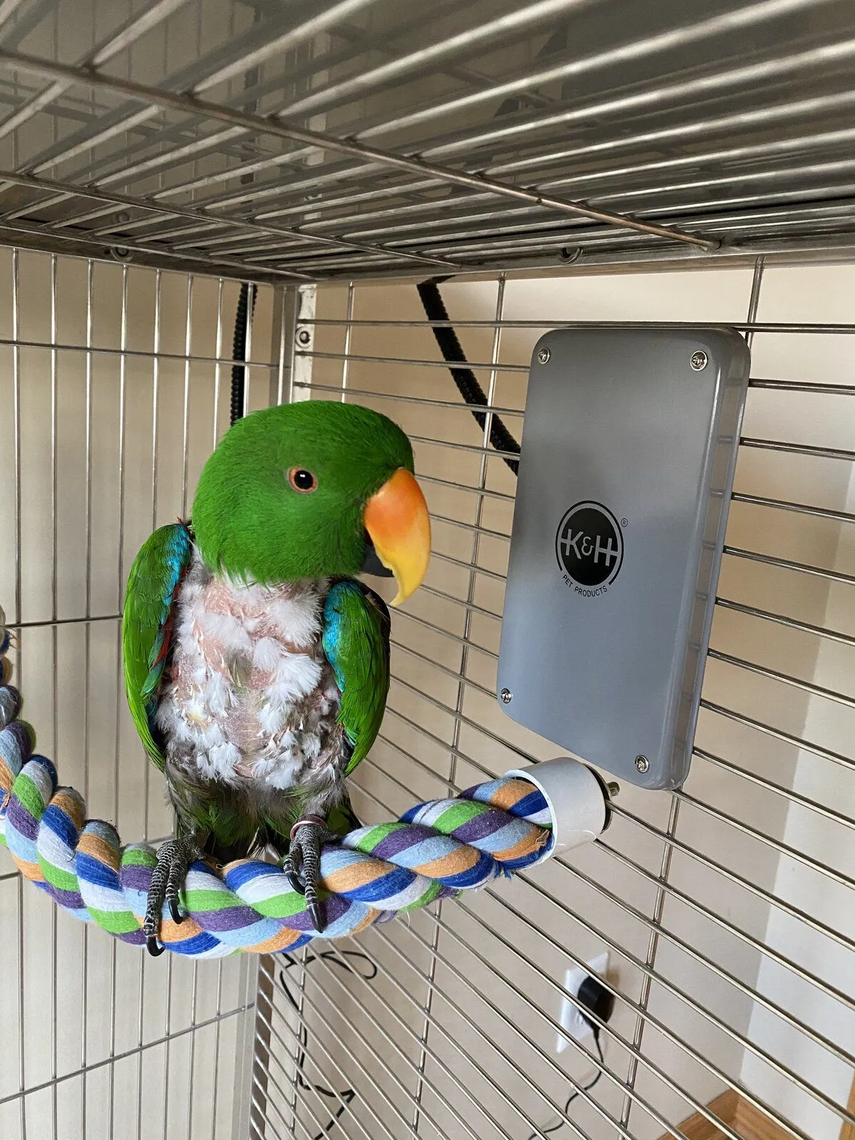Now my Marley has come to call his poncho his nighttime jammies. I don’t have to worry that he will be bored in the early AM hours. Come morning, Marley has his routine to go to his play-perch in the familyroom, remove his jammies, oversee the making of his morning veggies and kissing Dad before he goes to have breakfast. Since we have Marley wearing his jammies every night, the plucking wound is a thing of the past...at least we hope it is.