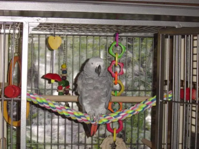 Basil arrived with just head and a few wing feathers intact. The rest was just grey fluff..His cage was far too small for him and he came to my friend because the wife of the previous owner hated him..