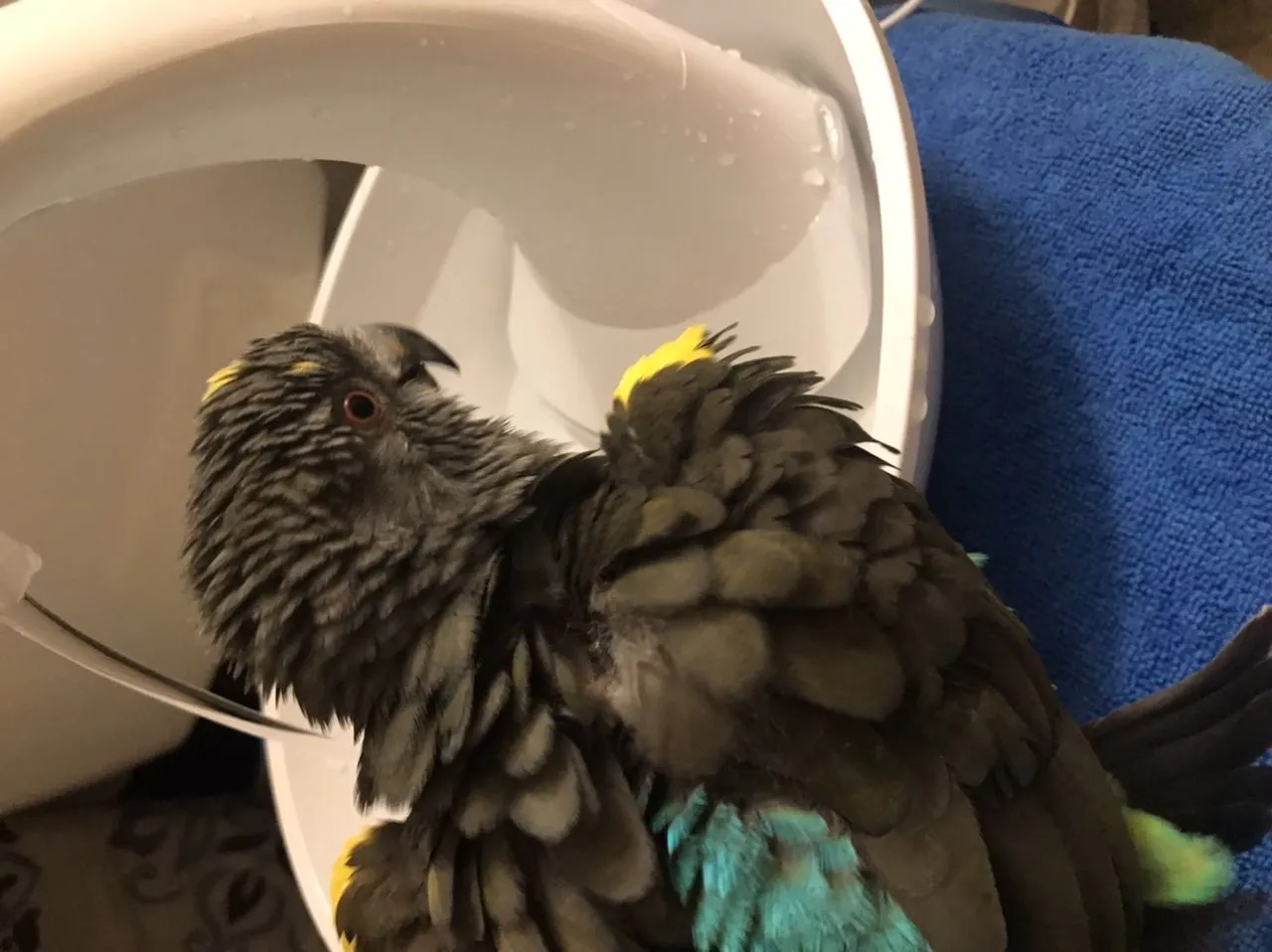 Now I am cuddling with my stinky wet bird. Maybe we’ll try the blow drier on low, better yet a few exchanges of towel. He’s only shook out a bit of the water.
