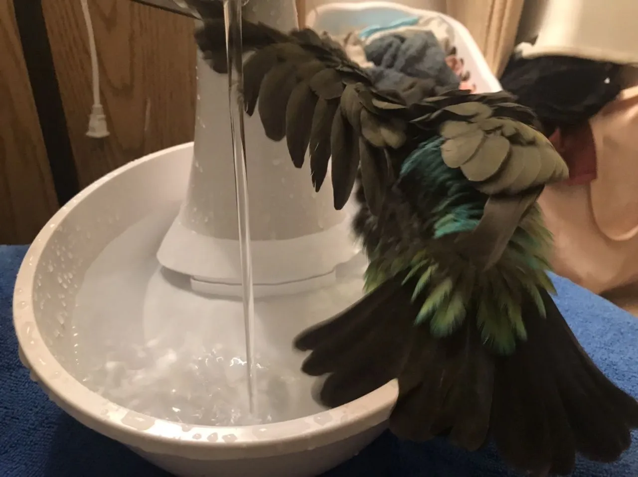 Thought I’d sit there and watch the fountain with Willow . Willow started making splashy water noises! Moved bird hand to Bath rim and Willow looked interested. Asked him to step up and he stepped onto the bath rim, watched my hand splash, then hopped in and bathed. He flapped and ducked and splashed and got very wet for about a minute while I cheered!